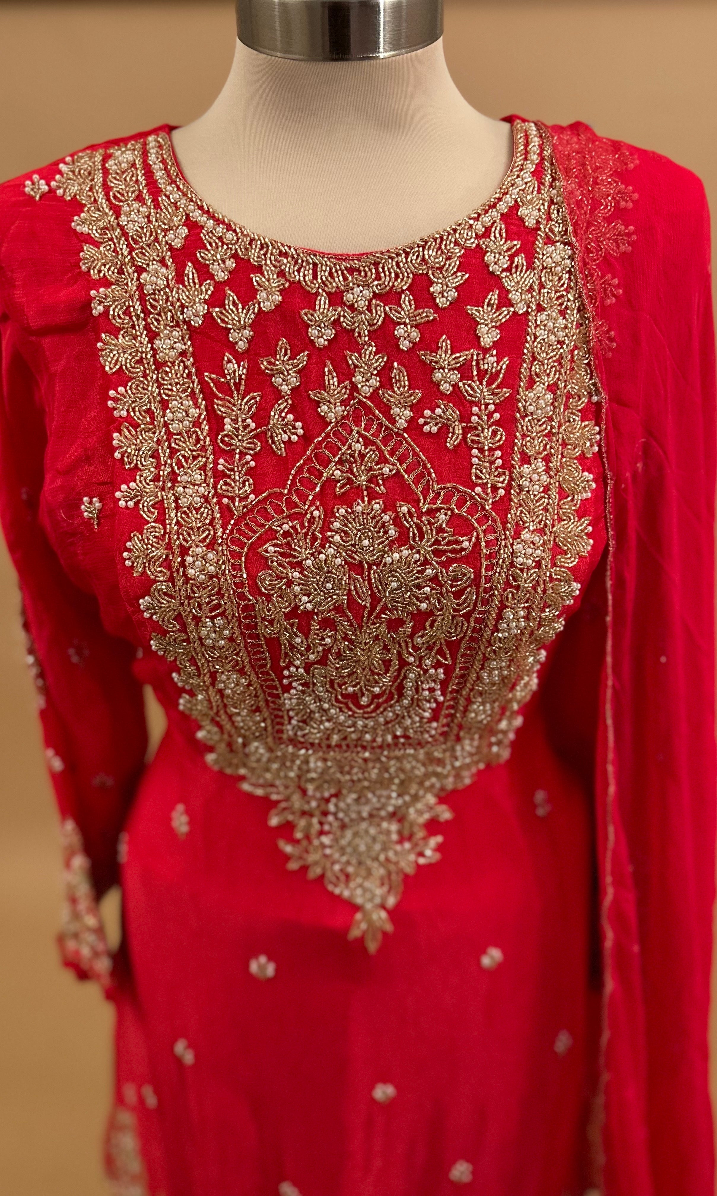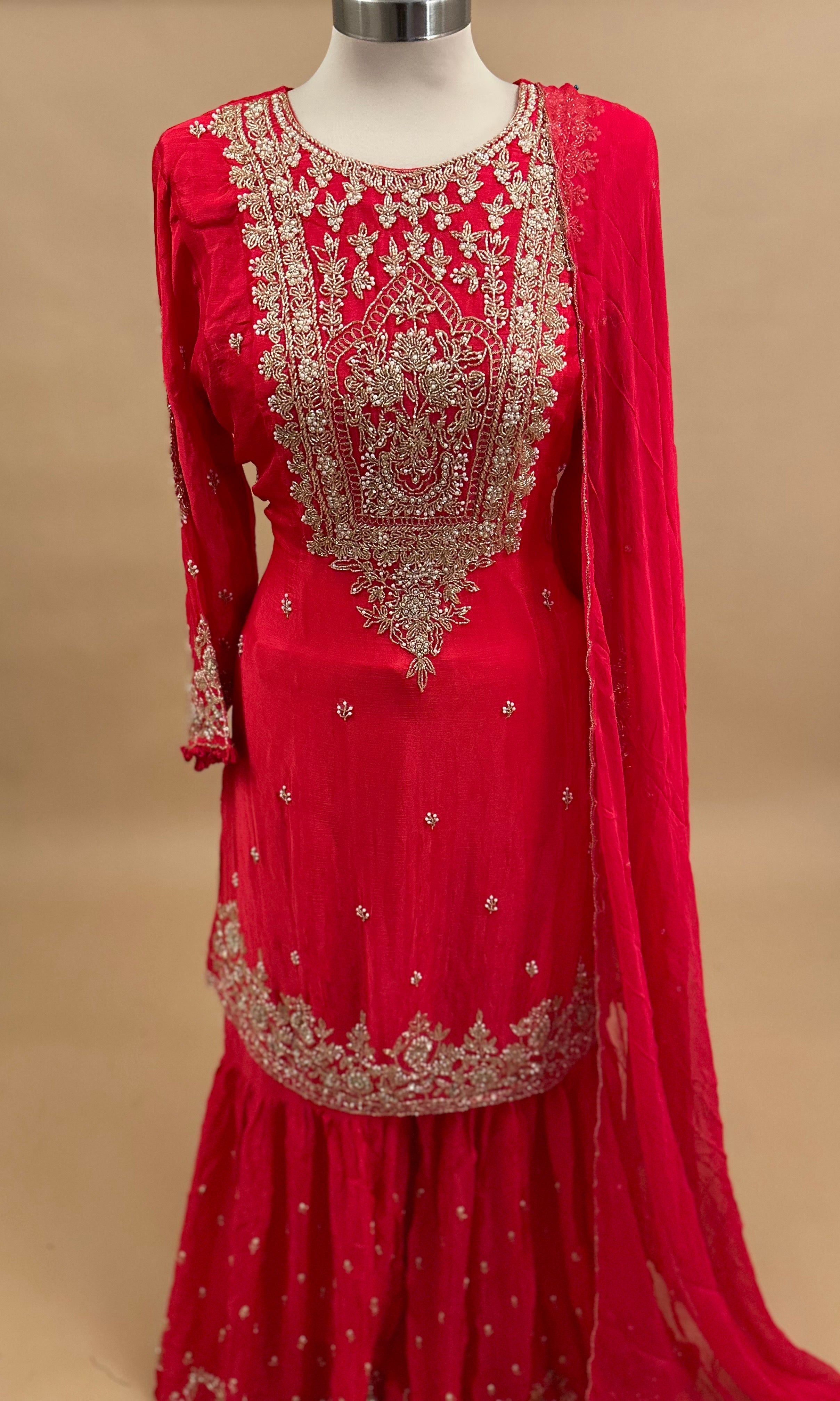 Elevate your party wardrobe with this stunning orang-red sharara suit, crafted from luxurious Dasheen fabric that drapes beautifully. The ensemble features intricate beads and stone embroidery work that adds sophisticated glamour to the elegant silhouette. The coordinating dupatta completes the refined look, making it an ideal choice for weddings, celebrations, and formal gatherings. Perfect for those seeking timeless style with contemporary flair.