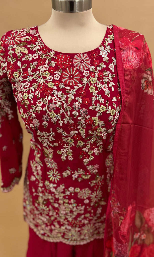 Elevate your ethnic wardrobe with this Pinkish Red Palazzo Suit crafted from lightweight georgette fabric for graceful drape and comfort. Featuring delicate stone embroidery, the suit adds subtle elegance, while the printed dupatta enhances its overall charm. Ideal for formal and semi-formal occasions, this ensemble balances traditional craftsmanship with modern style.