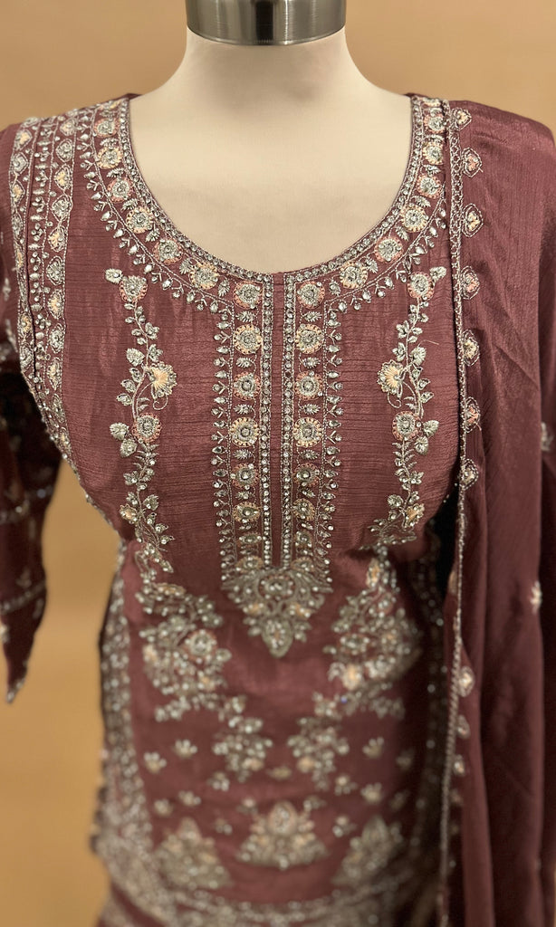 This light weight maroon party wear sharara suit features intricate stone embroidery that adds elegant sparkle. Crafted from soft chinon fabric, it offers comfort and a graceful drape for festive occasions. The matching dupatta completes the ensemble, making it a refined choice for special events.