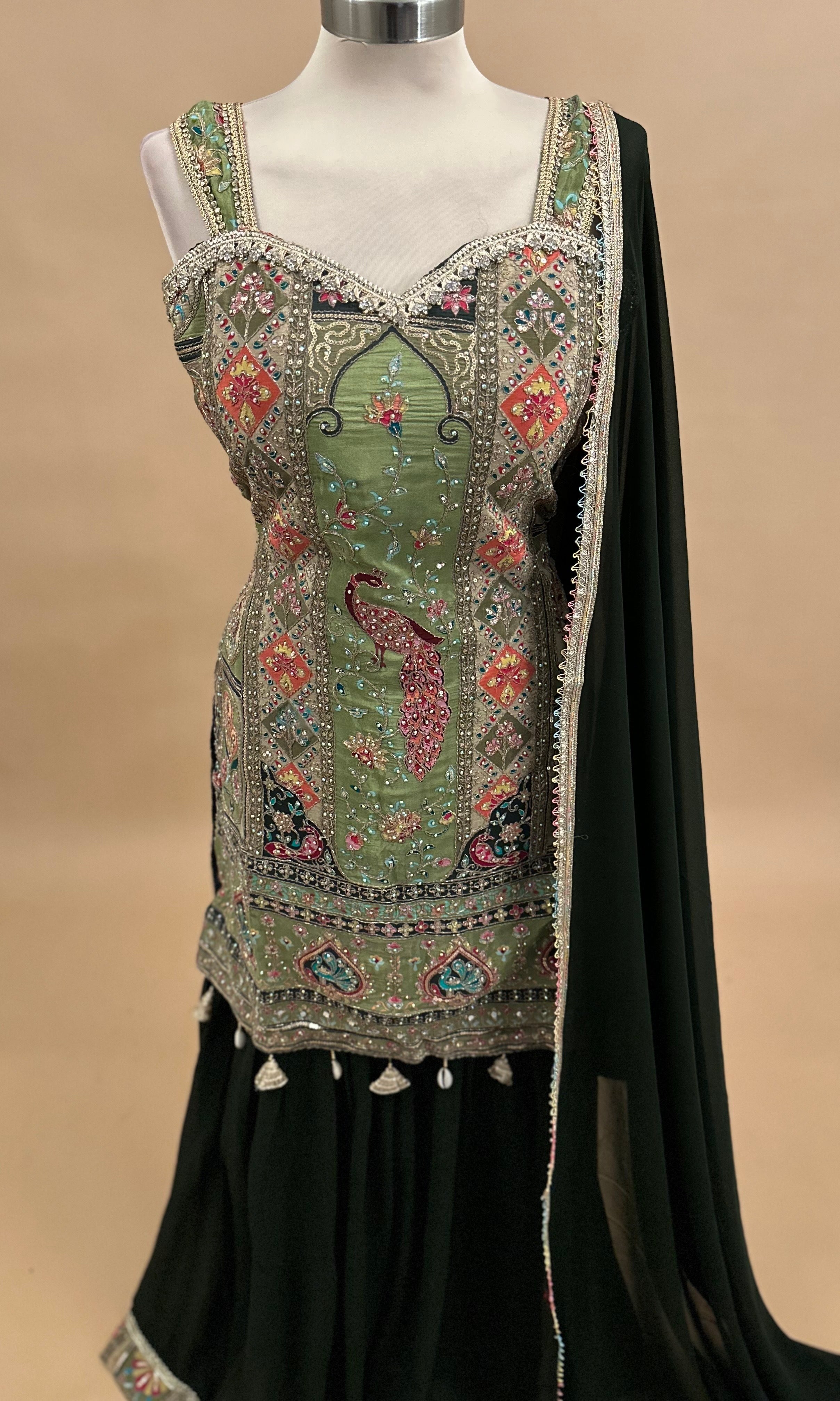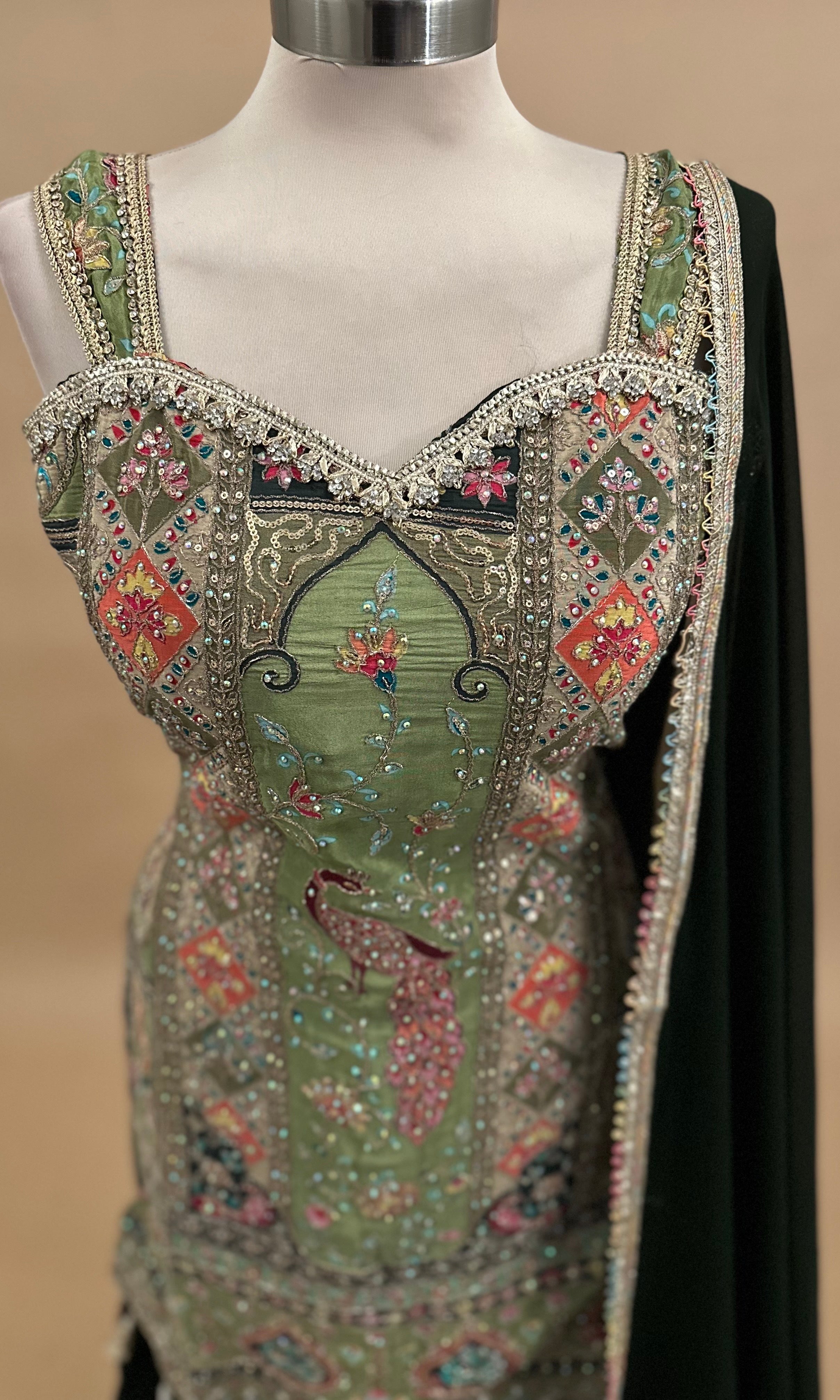 Elevate your festive wardrobe with this stunning peacock-designed sharara suit, crafted from lightweight chinon fabric perfect for elegant gatherings. The rich Green color is beautifully enhanced by intricate stone work embroidery that captures traditional artistry with contemporary flair. This three-piece ensemble includes a coordinating dupatta, offering versatility for various styling options. The breathable chinon material ensures comfort throughout extended wear, while the refined peacock motif adds a sophisticated touch to your party look. Ideal for weddings, celebrations, and special occasions where timeless elegance meets modern sensibility.