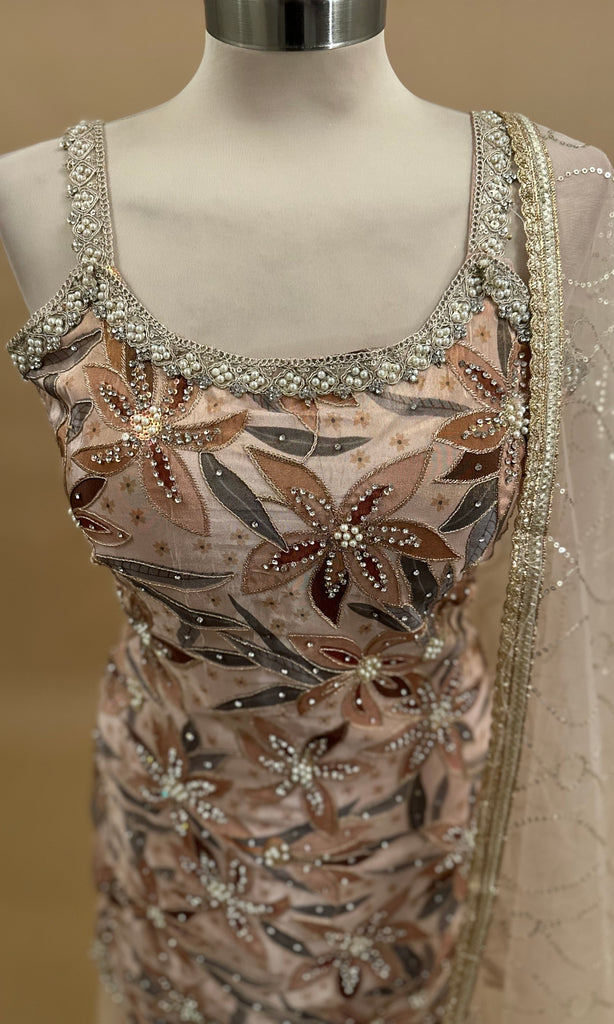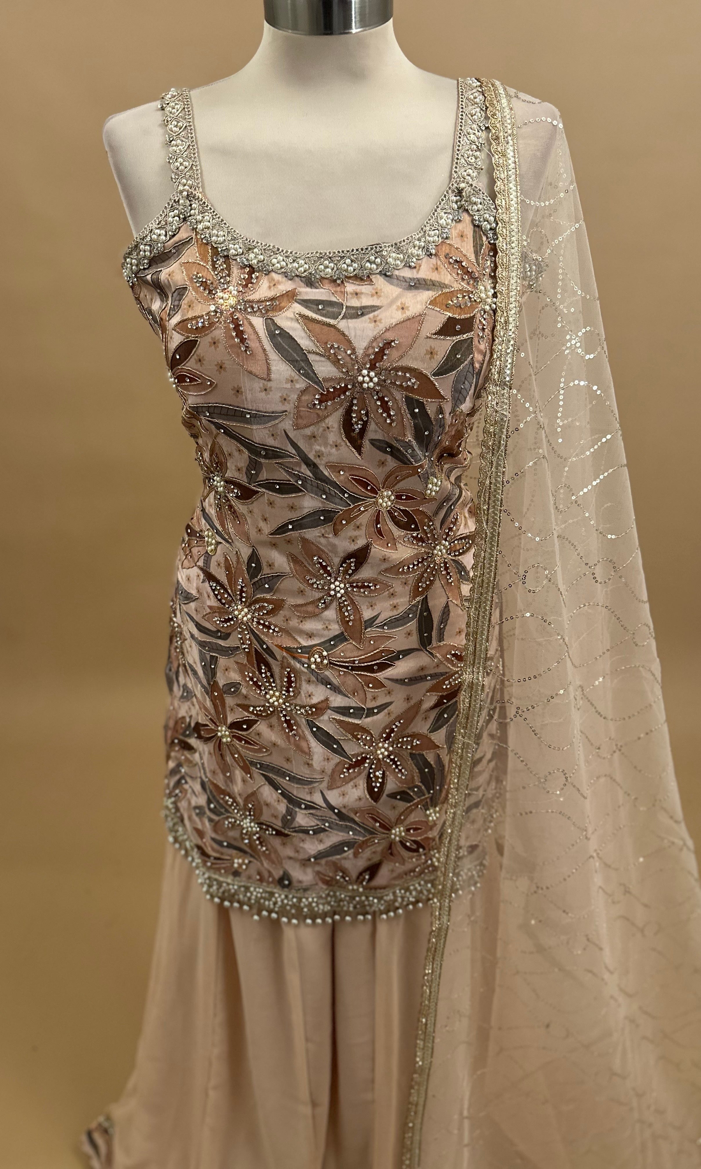 Elevate your ethnic wardrobe with this exquisite Peach palazzo suit, crafted from luxurious georgette fabric. Adorned with intricate pearl and stone embroidery work, this ensemble features a sophisticated color palette that complements all skin tones. The flowing palazzo silhouette offers comfort without compromising on elegance, while the included dupatta adds versatility for layering and styling. Perfect for weddings, festive occasions, or upscale gatherings, this piece combines traditional craftsmanship with contemporary design sensibilities.