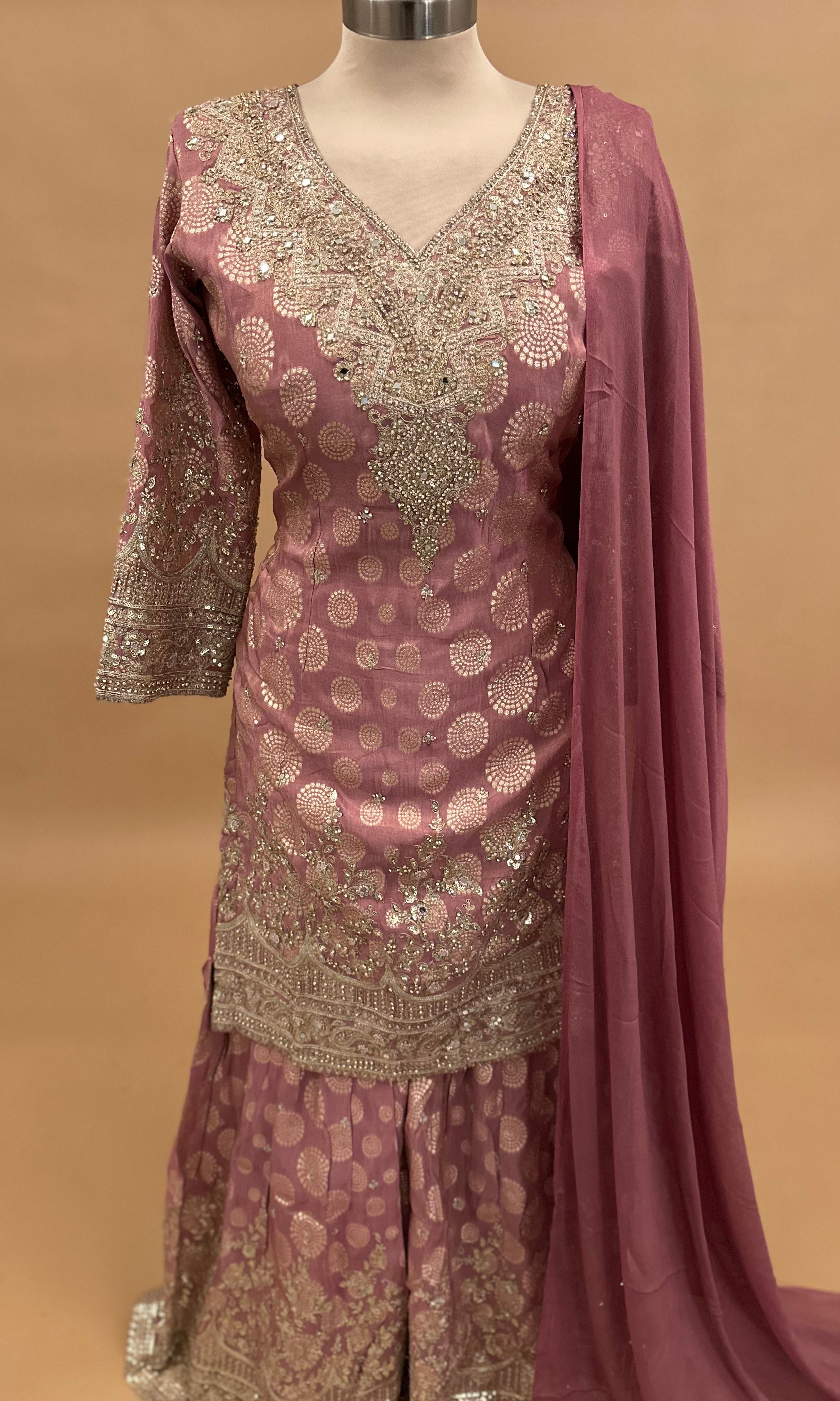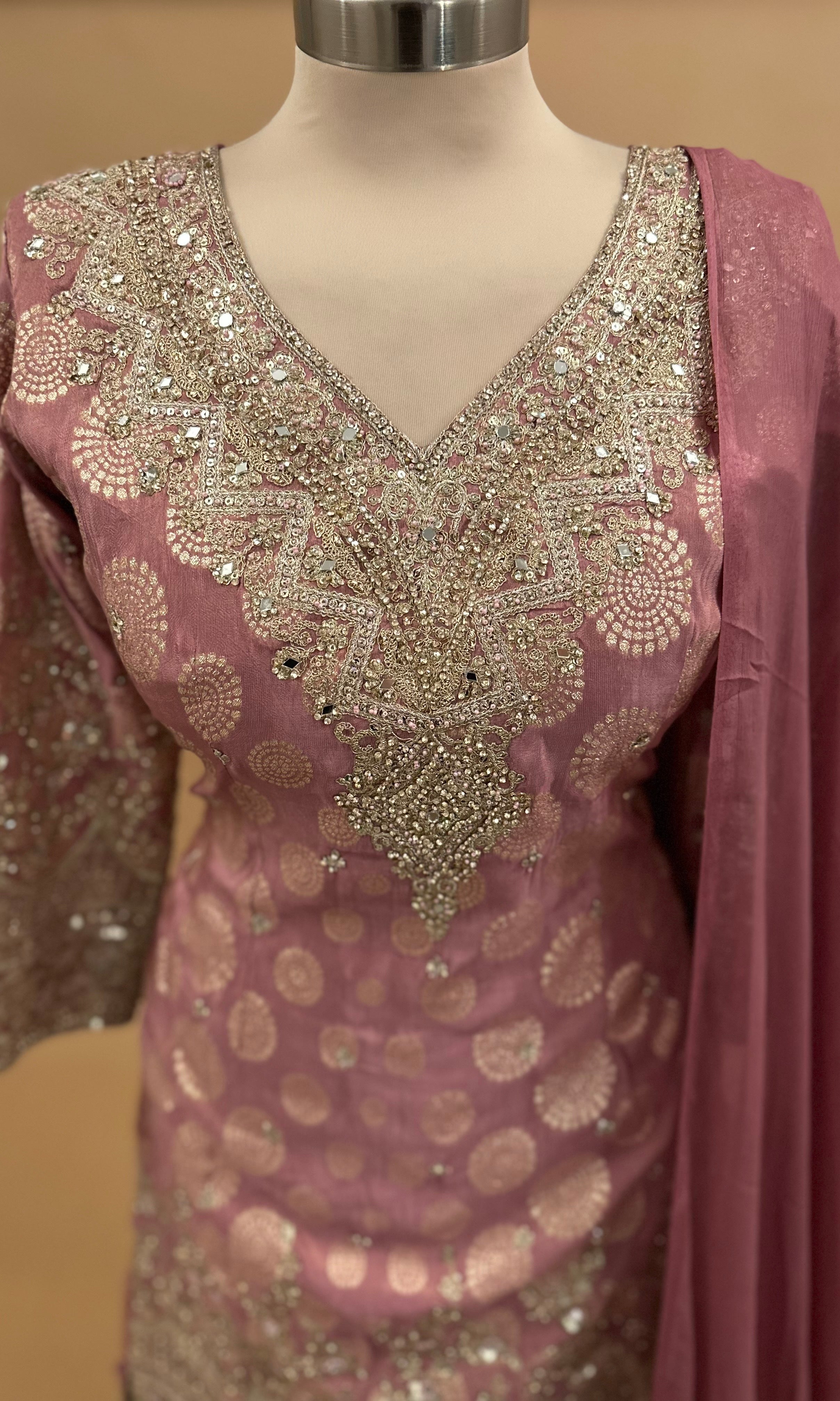 Elevate your ethnic wardrobe with this elegant Pink full sleeves sharara suit crafted from rich Banarasi silk. Featuring intricate stone embroidery, the suit exudes timeless charm and craftsmanship. Paired with a matching dupatta, this ensemble blends traditional artistry with luxurious fabric, perfect for festive occasions and formal gatherings. The breathable silk ensures comfort while making a stately style statement.