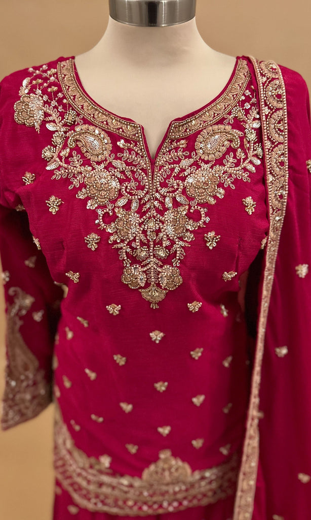 Elevate your festive wardrobe with this pinkish red palazzo suit crafted from soft Chinon fabric. Featuring exquisite hand-embroidered beadwork, this party wear set combines traditional artistry with contemporary style. The accompanying dupatta completes the look, making it perfect for celebrations and special occasions where elegance and comfort are essential.