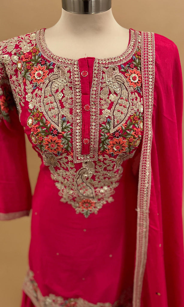 Elevate your festive wardrobe with this Pinkish Red Color Light Weight Party Wear Sharara Suit. Crafted from delicate Chinon fabric, it offers both comfort and elegance. The intricate stone embroidery adds a refined sparkle, perfect for special occasions. Complete with a matching dupatta, this suit ensures a graceful and stylish presence at every celebration.