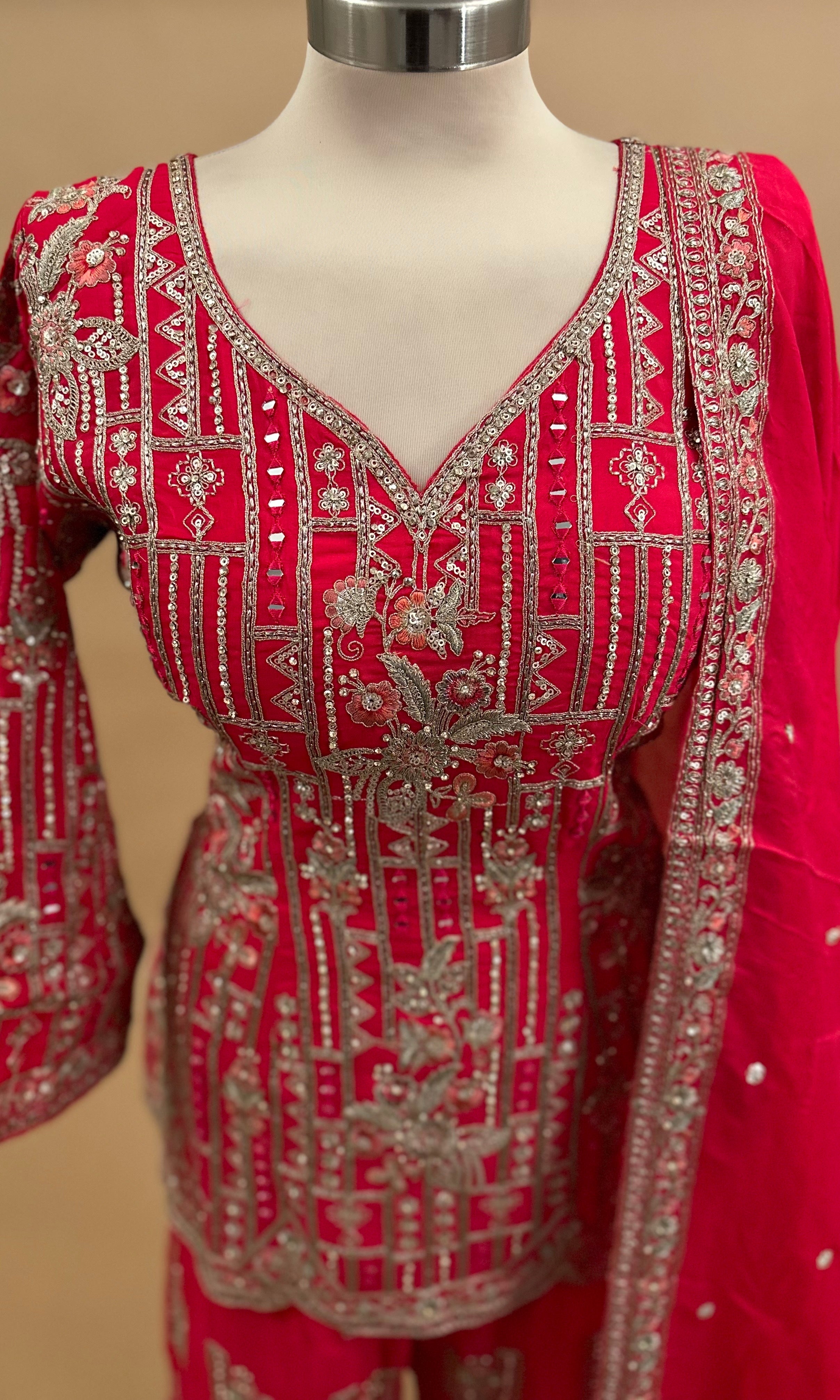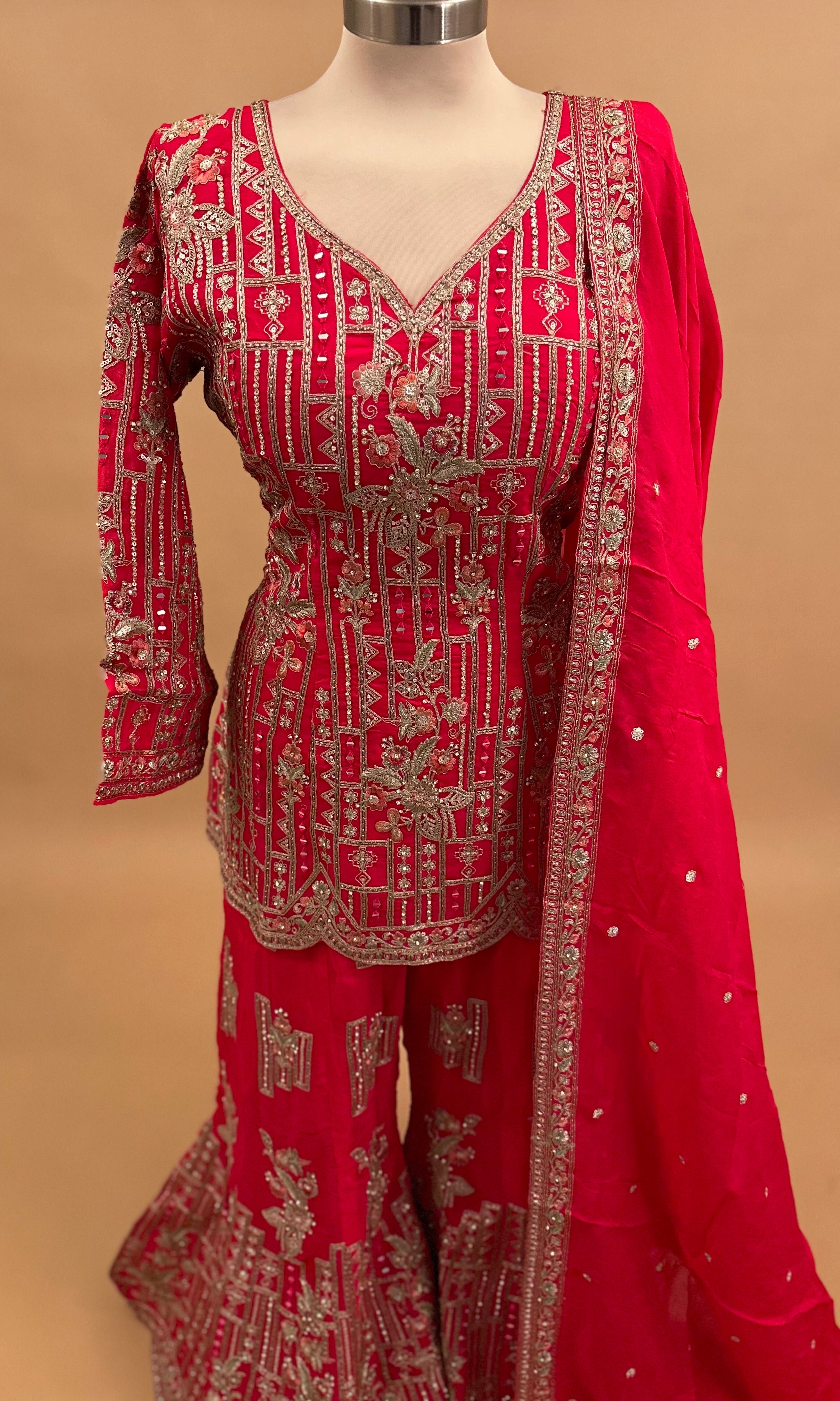 Elevate your ethnic wardrobe with this stunning pinkish red sharara suit, meticulously crafted with intricate stone work embroidery. The ensemble features a beautifully embellished kurta paired with flowing sharara pants and a coordinating dupatta, creating an elegant silhouette perfect for weddings, celebrations, and special occasions. The rich pinkish red hue complements the detailed stone embroidery, adding sophistication and traditional charm. This three-piece set combines timeless design with contemporary styling, making it an ideal choice for those seeking refined ethnic fashion.