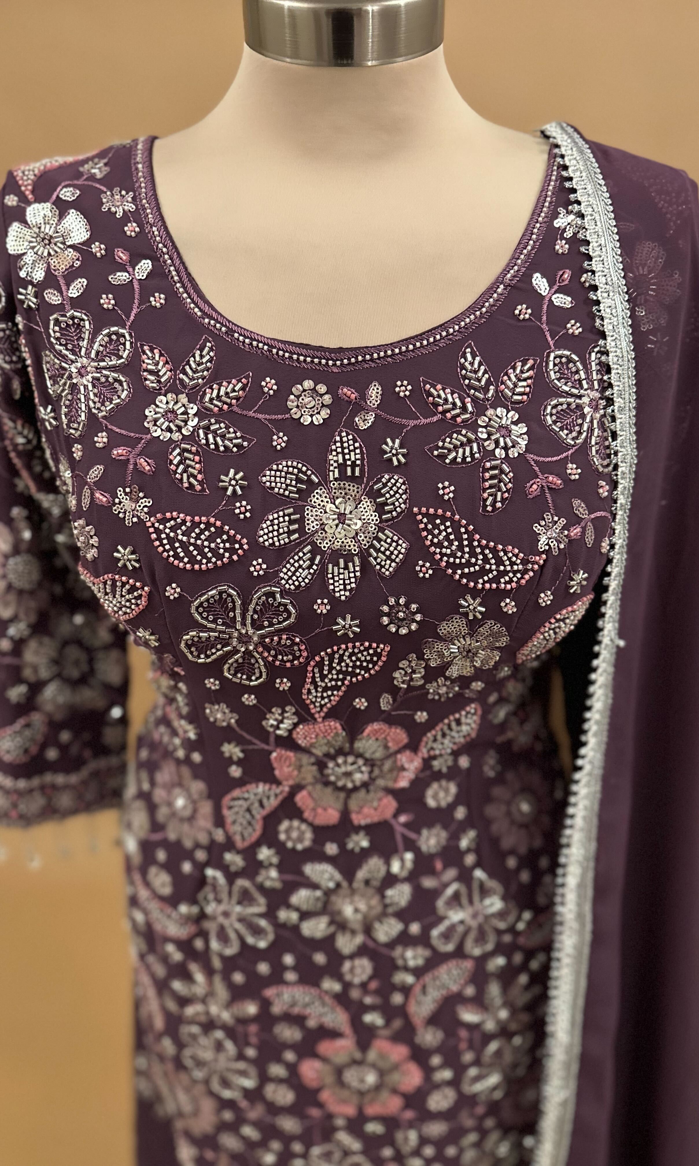 This elegant Plum Purple palazzo suit features exquisite beads work embroidery on soft georgette fabric, perfect for party occasions. The lightweight material ensures comfort while the intricate bead detailing adds a sophisticated touch. Complete with a matching dupatta, this ensemble offers a graceful silhouette that combines traditional craftsmanship with contemporary style. Ideal for festive gatherings and special events, this suit balances comfort and elegance effortlessly.
