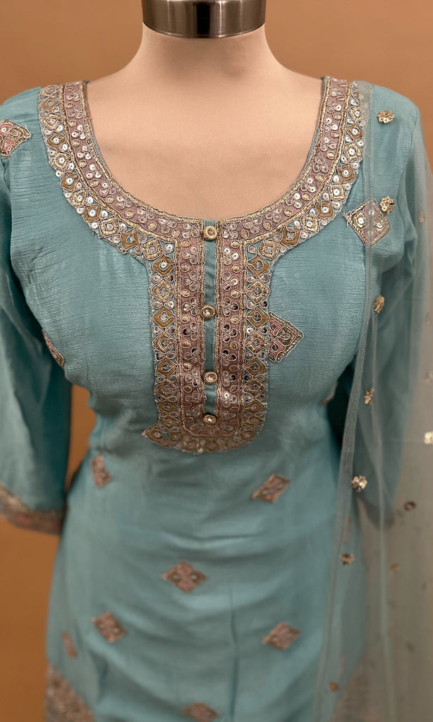 Elevate your festive wardrobe with this Chinon fabric palazzo suit in a sophisticated Blue Color. Featuring intricate stone embroidery, this ensemble blends traditional craftsmanship with contemporary style. The comfortable Chinon fabric ensures a graceful drape and ease of movement, while the matching dupatta completes the elegant look, making it perfect for parties and special occasions.