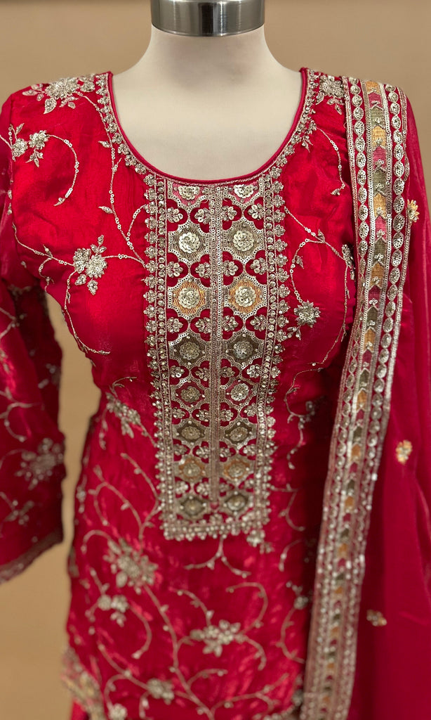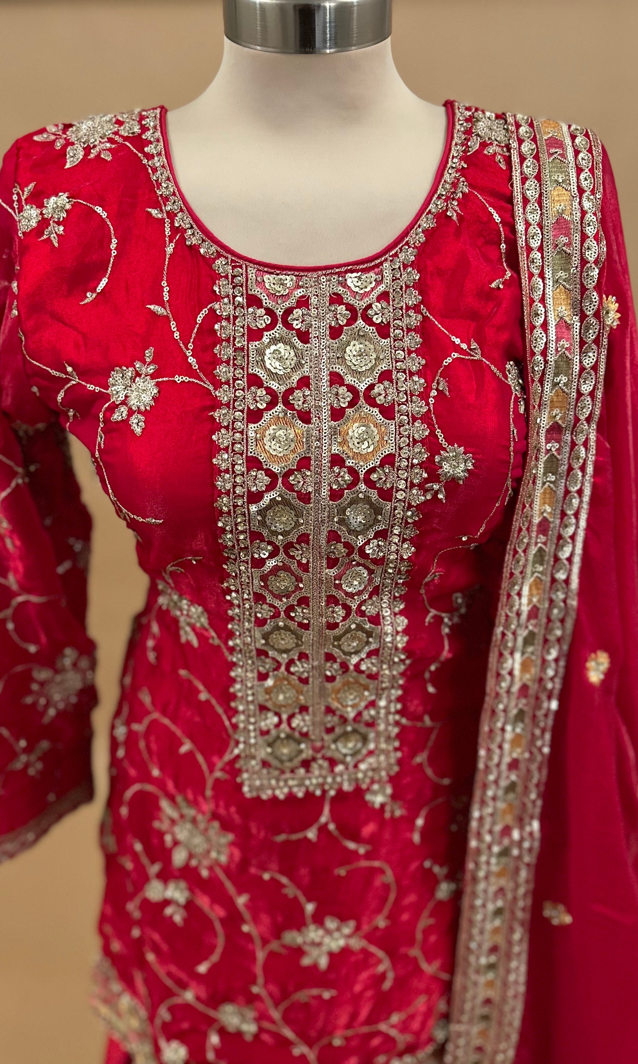 This exquisite Farshi Salwar Suit in rich Red features intricate stone work embroidery, lending a sophisticated sparkle ideal for party wear. Crafted from a silk-like fabric, it offers a smooth, elegant drape that enhances comfort and style. The ensemble includes a matching dupatta, completing the traditional yet contemporary look perfect for special occasions.