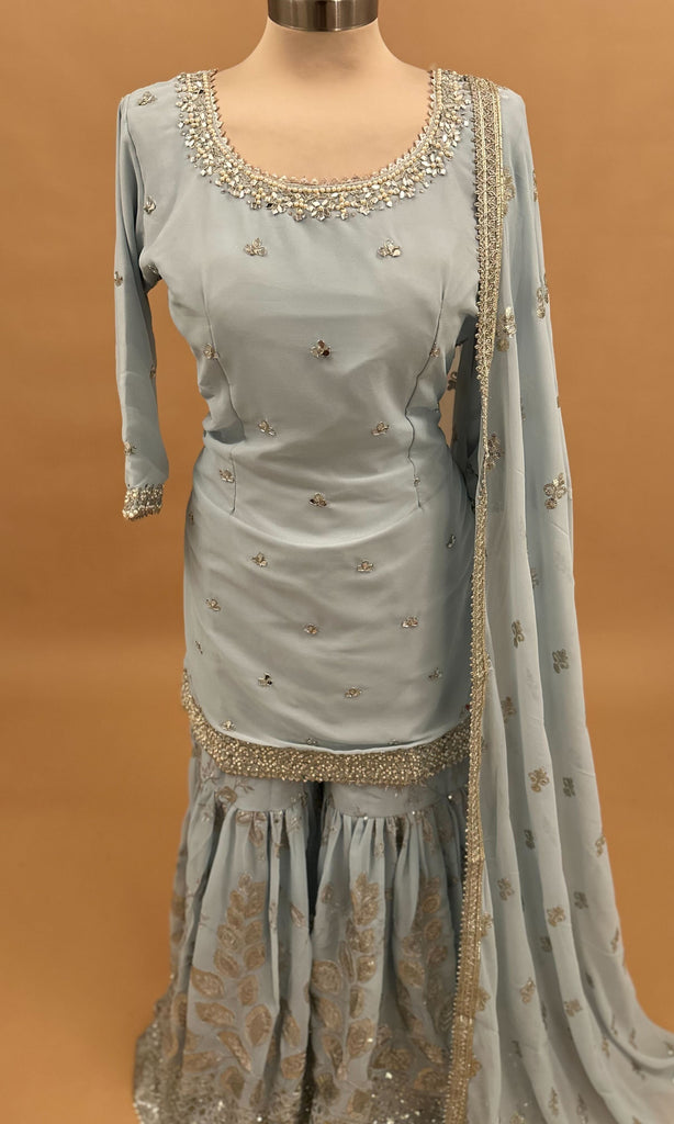 Light Weight Sky Blue Color Sharara Suit On Georgette Fabric With Dupatta