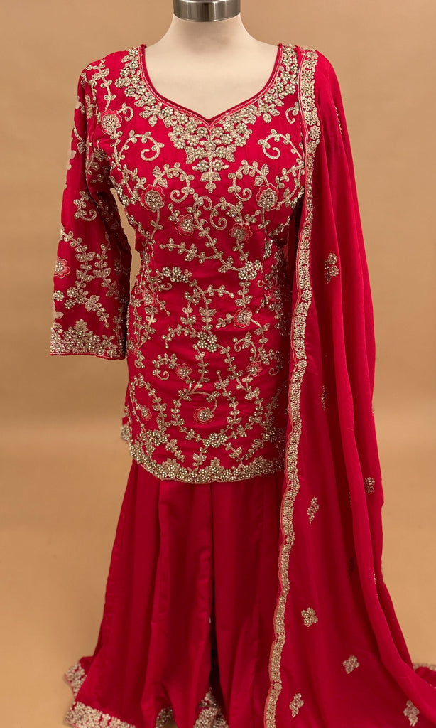 Pinkish Red Color Hand Work Embroidered Party Wear Palazzo Suit With Dupatta