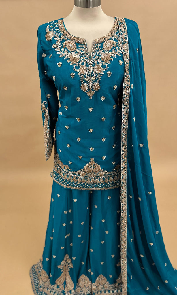 Hand Work Embroidered Party Wear Palazzo Suit Blue Color With Dupatta