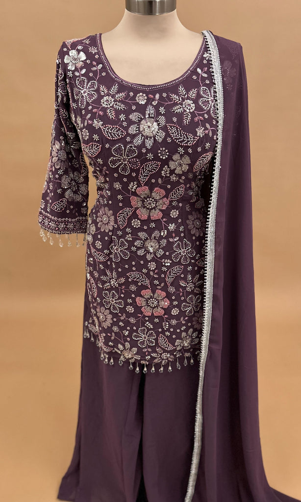Plum Purple Color Beads Work Embroiderey Party Wear Palazzo Suit With Dupatta