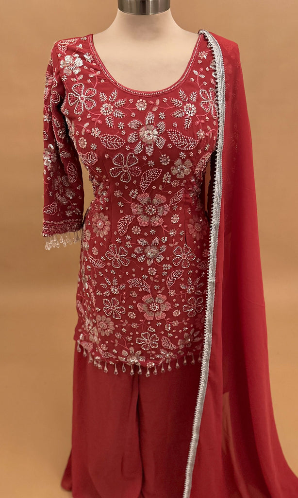 Rust Color Beads Work Embroiderey Party Wear Palazzo Suit With Dupatta