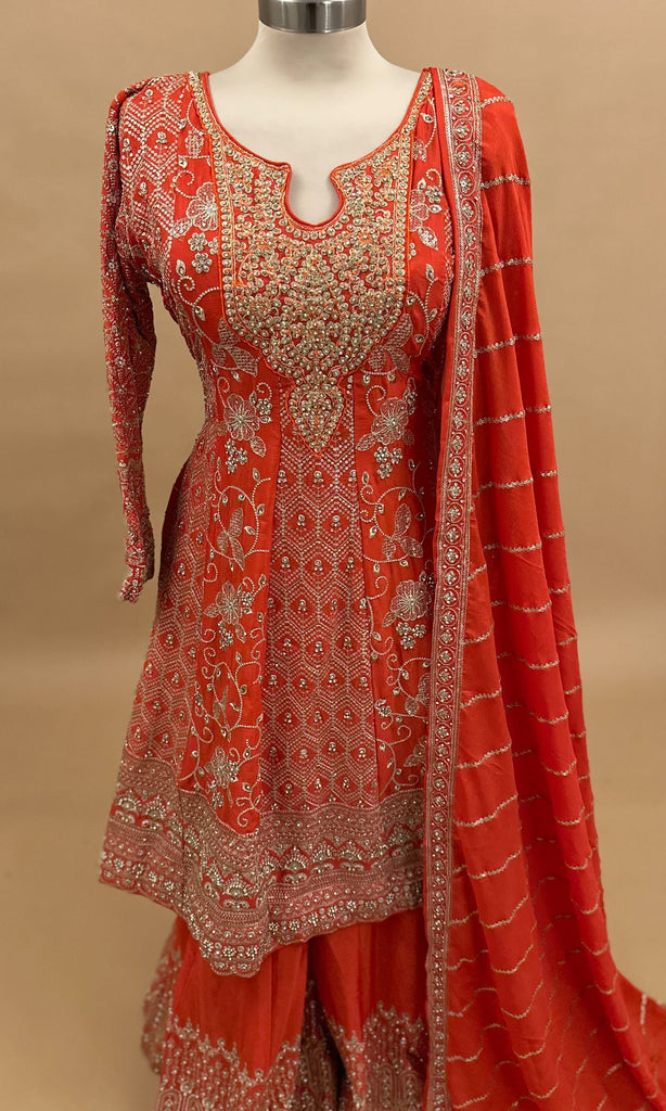 Orange Color Heavy Stone Work Embroiderey A Line Anarkali Palazzo Suit With Dupatta
