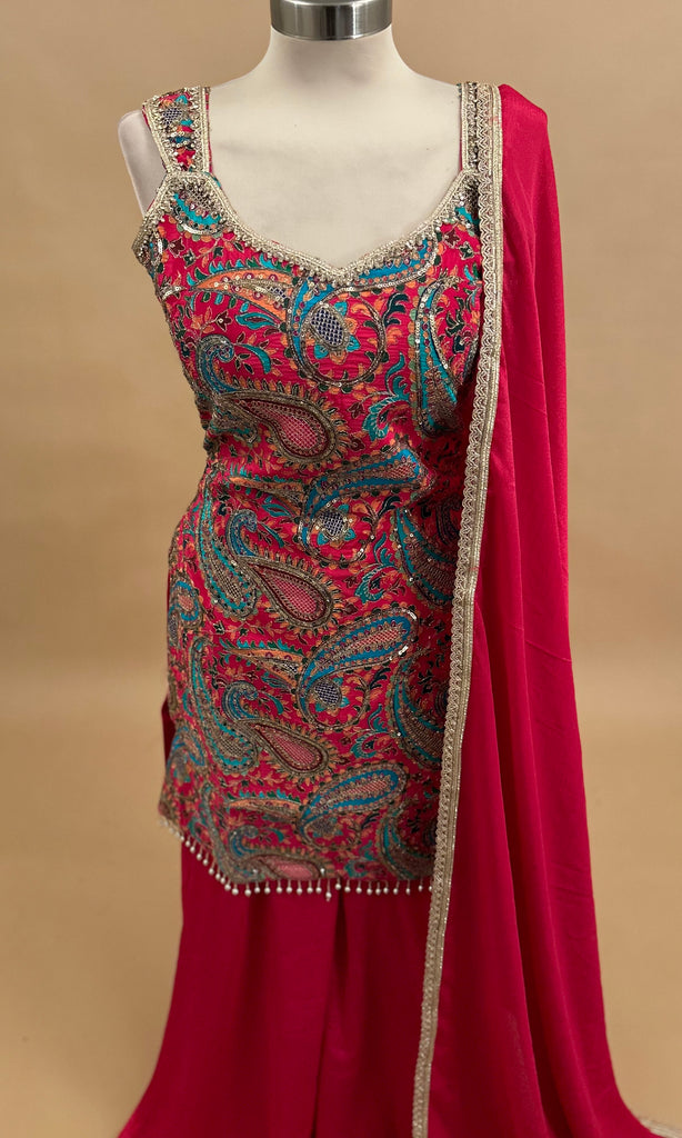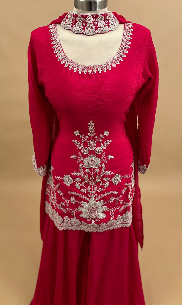 Chinon Fabric Light Weight Pinkish Red Color Palazzo Suit With Dupatta