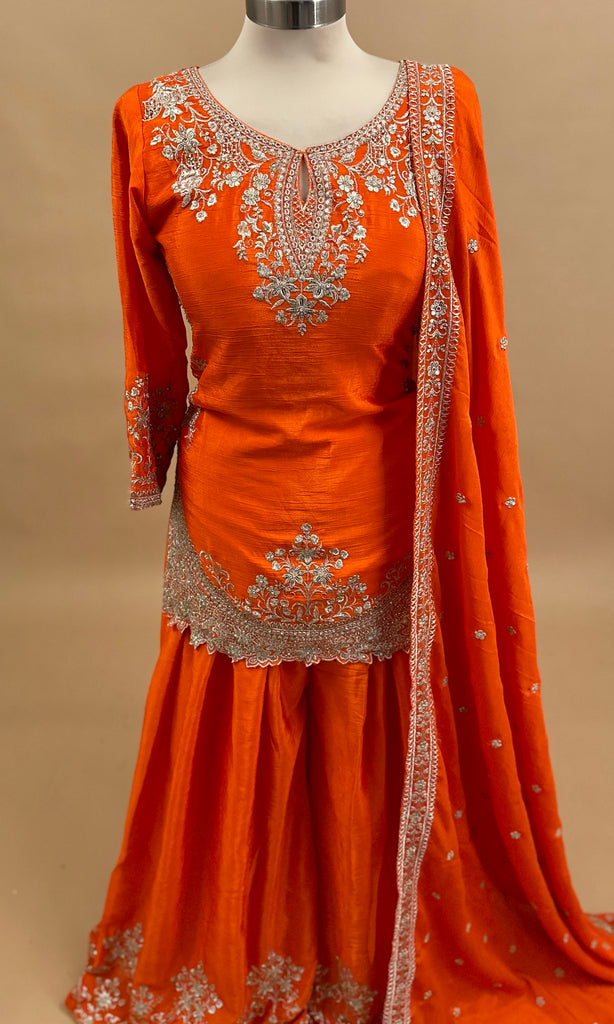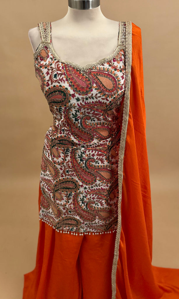 Orange Color Chinon Fabric Party Wear Palazzo Suit With Dupatta