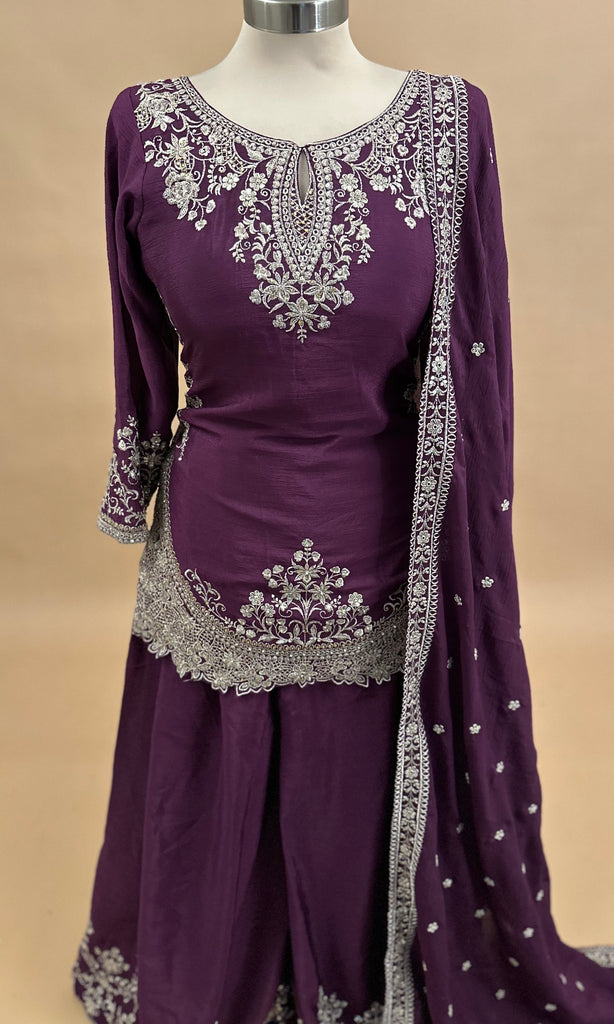 Dark Purple Color Chinon Fabric Party Wear Palazzo Suit With Dupatta