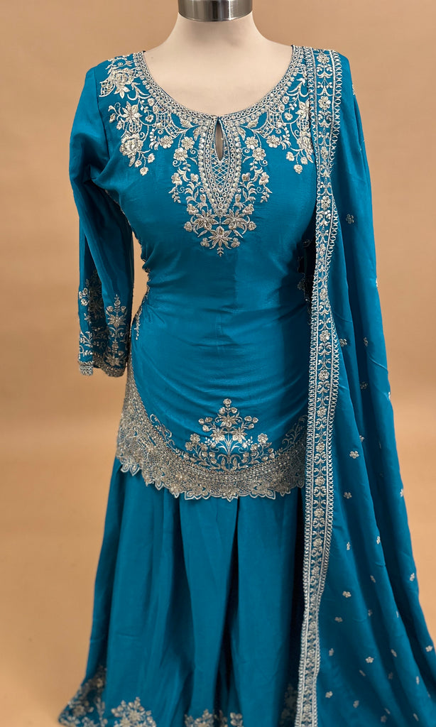 Chinon Fabric Teal Blue Color Choker Style Dupatta Party Wear Palazzo Suit With Dupatta