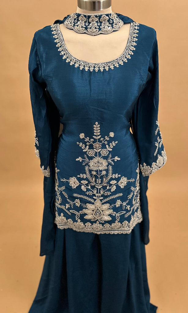 Chinon Fabric Blue Color Party Wear Palazzo Suit With Dupatta