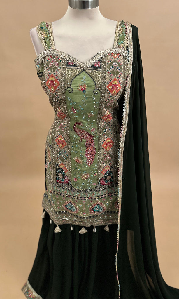 Peacock Design Light Weight Party Wear Green Color Sharara Suit With Dupatta