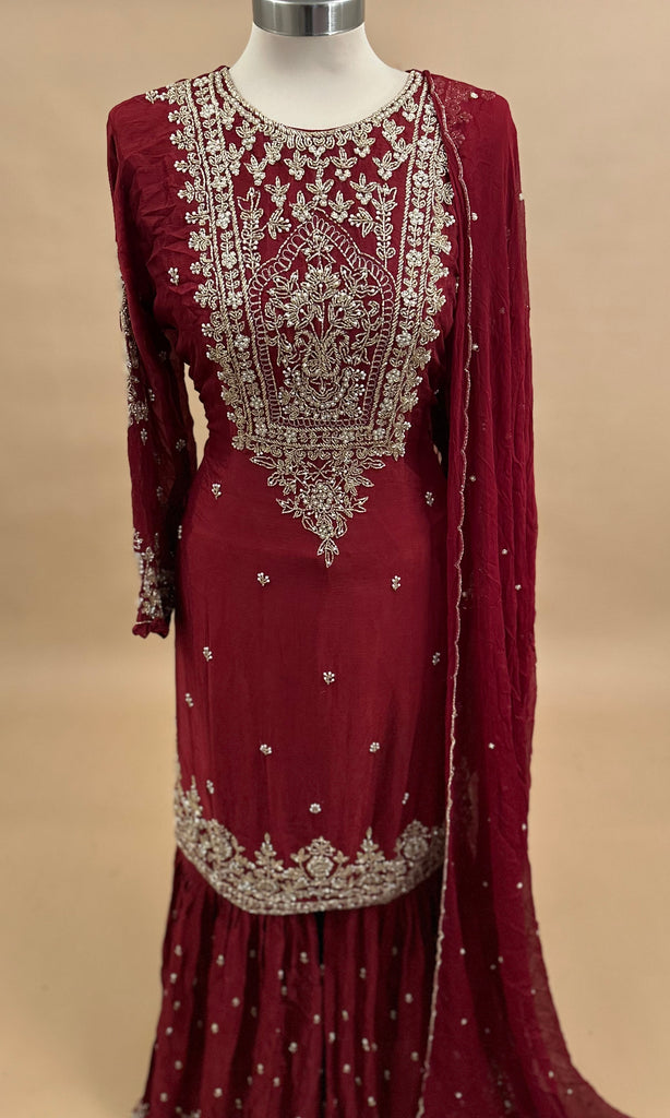 Elegant Style Party Wear Sharara Suit Maroon Color With Dupatta