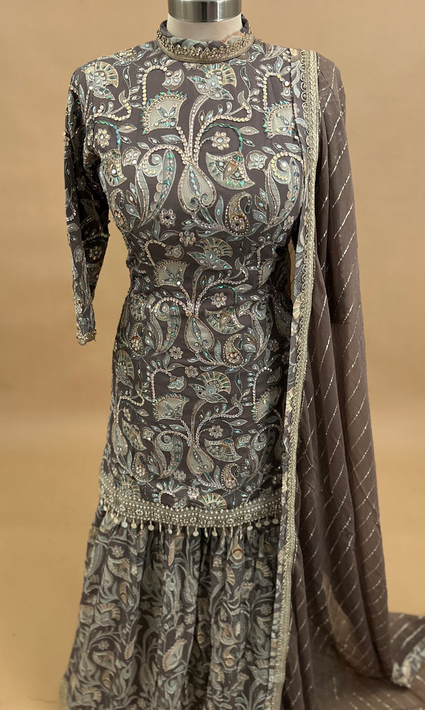 Dasheen Fabric Mouse Color Party Wear Sharara Suit With Matching Dupatta
