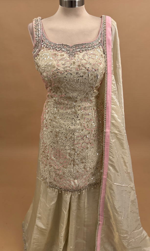 Dasheen Fabric Party Wear Sharara Suit Off White Color With Matching Dupatta