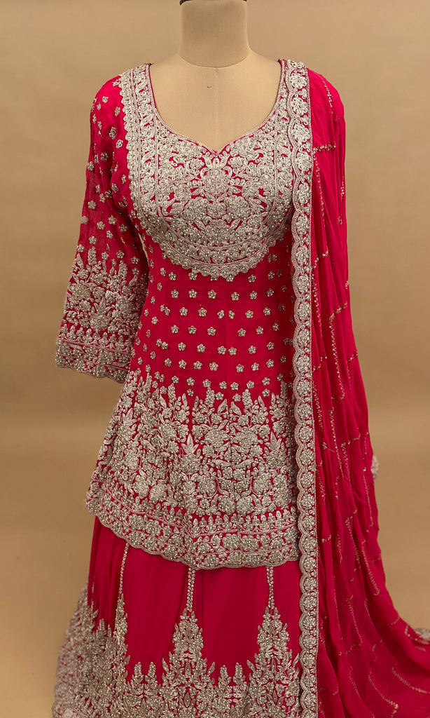 Heavy Stone Work Embroiderey Peplum Style Outfit With Skirt In Pinkish Red Color