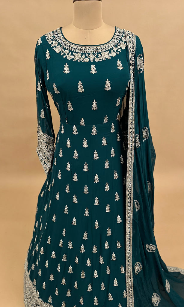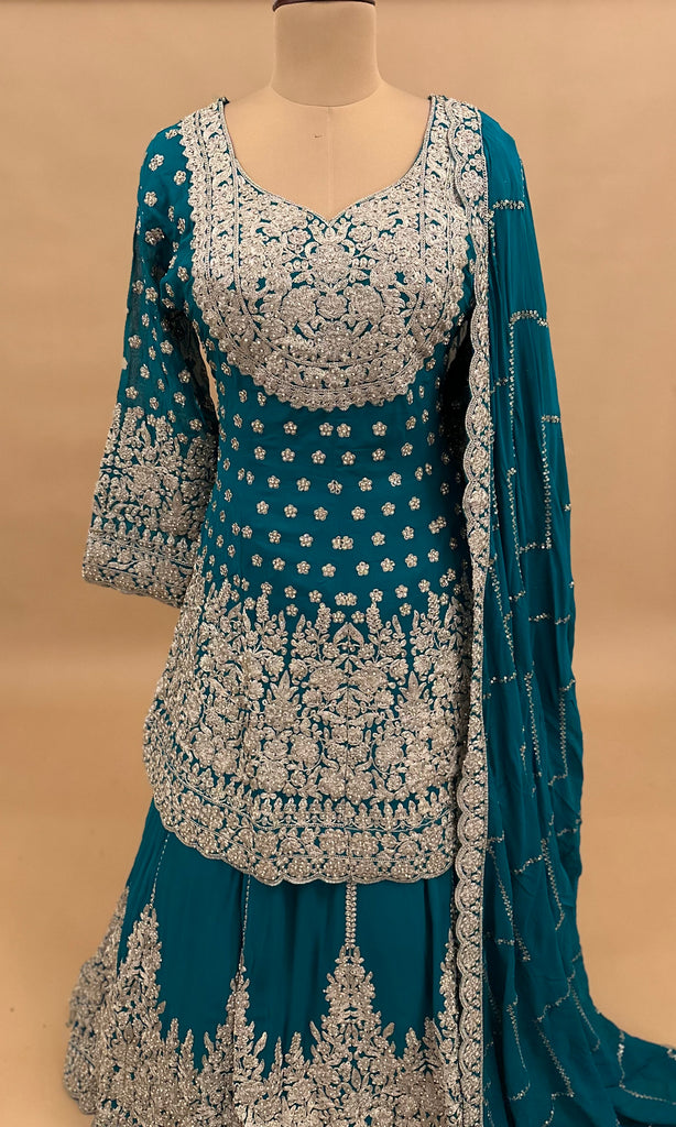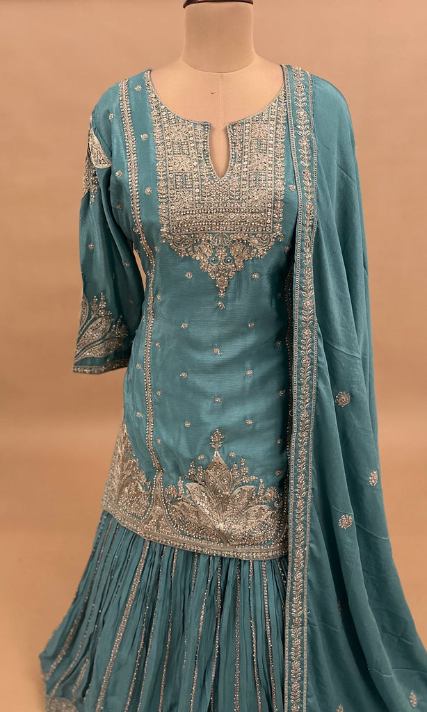 Teal Blue Color On Chinon Fabric Outfit With Skirt On Bottom