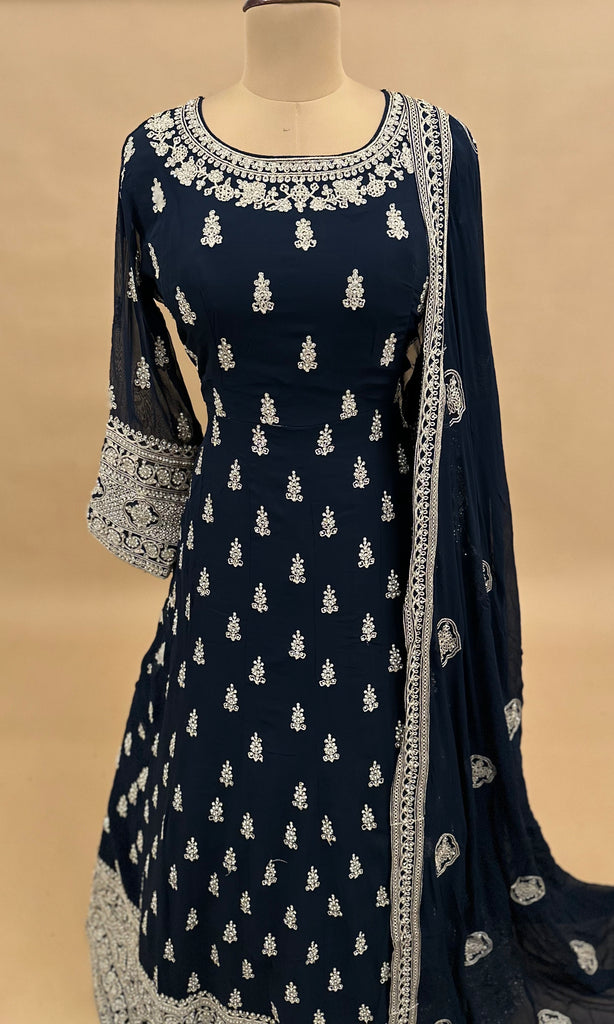 Dark Navy Blue Color Heavy Stone Work Embroiderey Long Dress With Dupatta