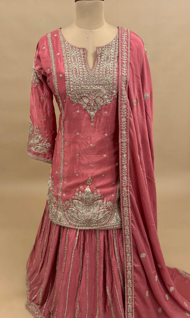 Blush Pink Color On Chinon Fabric Outfit With Skirt On Bottom