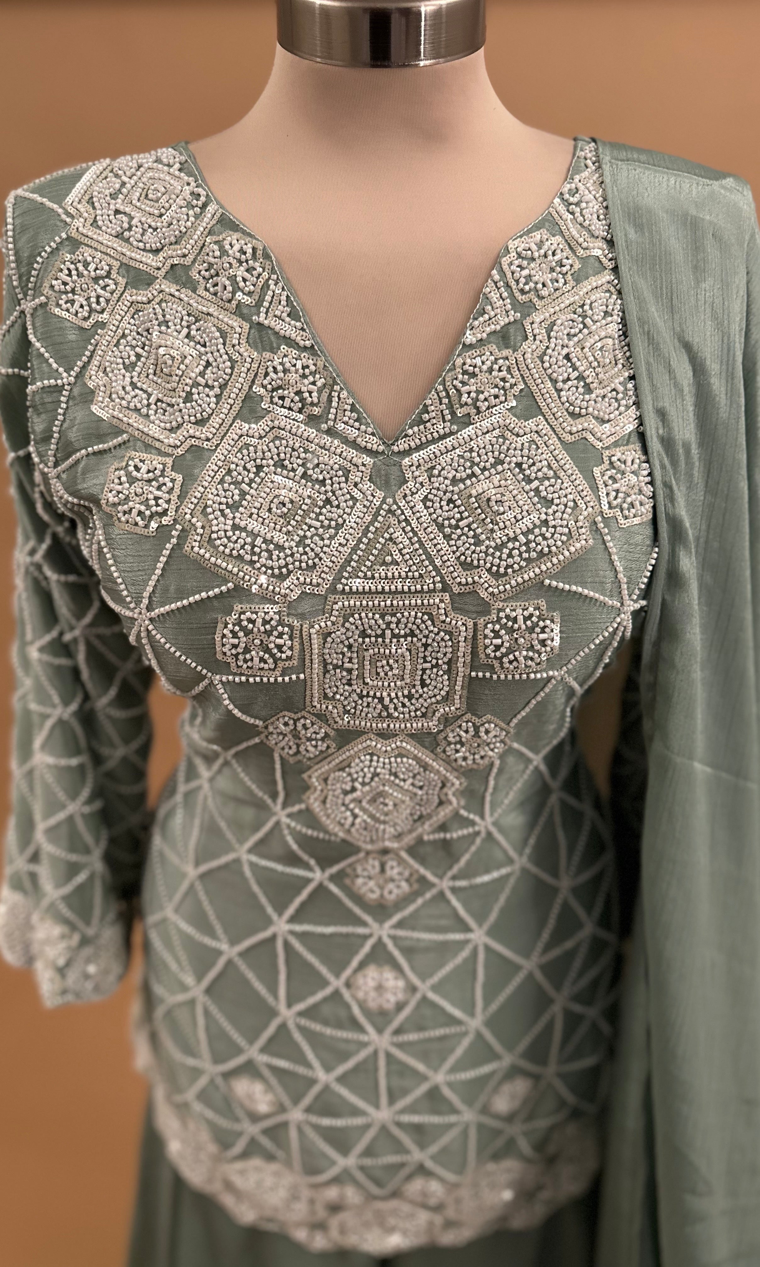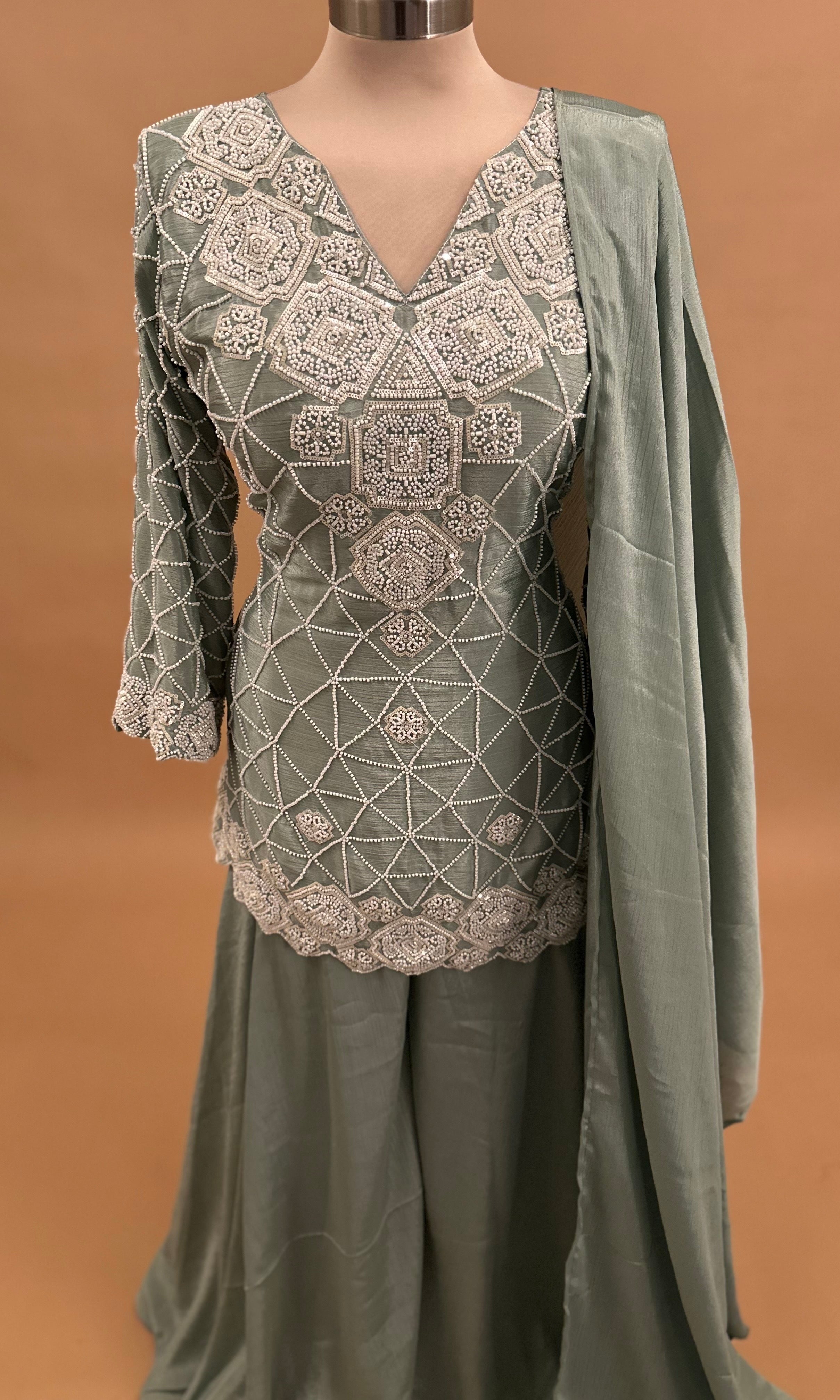 Elevate your festive wardrobe with this stunning Light Bonsai Green palazzo suit, meticulously crafted for sophisticated celebrations. The ensemble features intricate beads work embroidery that catches light beautifully, creating an elegant shimmer across the fabric. The flowing palazzo silhouette offers graceful movement and comfort, while the coordinating dupatta completes the traditional look with refined style. Perfect for weddings, parties, and special occasions, this piece combines timeless craftsmanship with contemporary design. The luxurious shimmer fabric ensures you'll stand out with understated glamour.