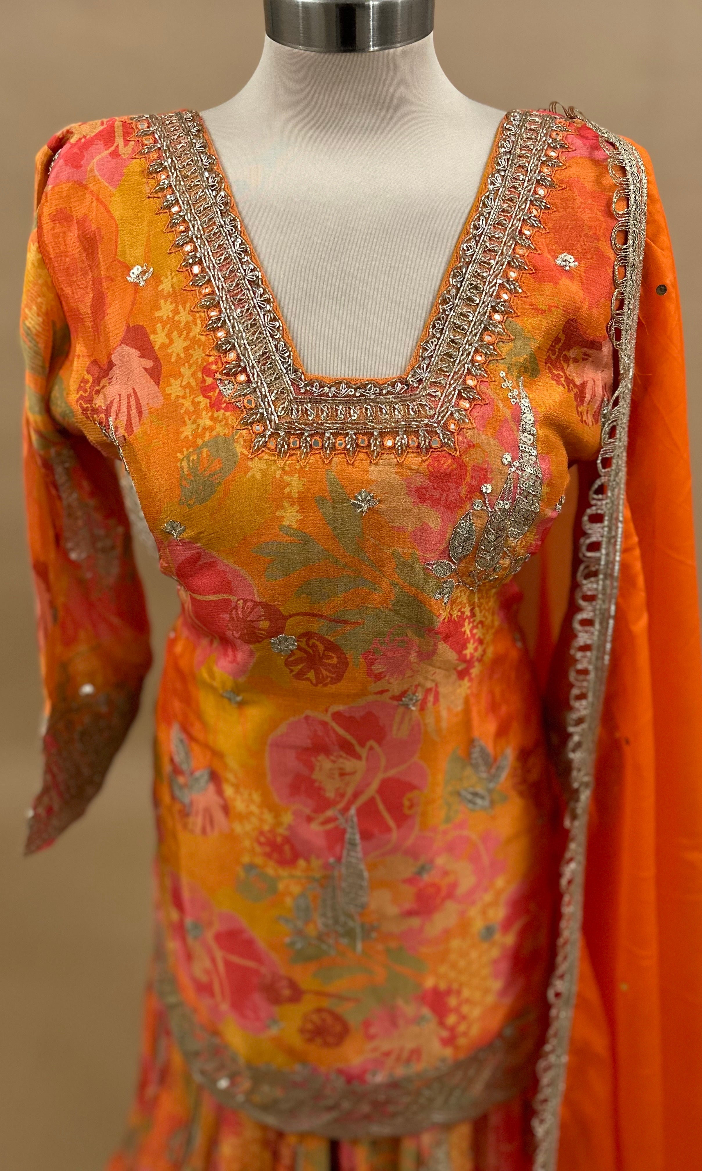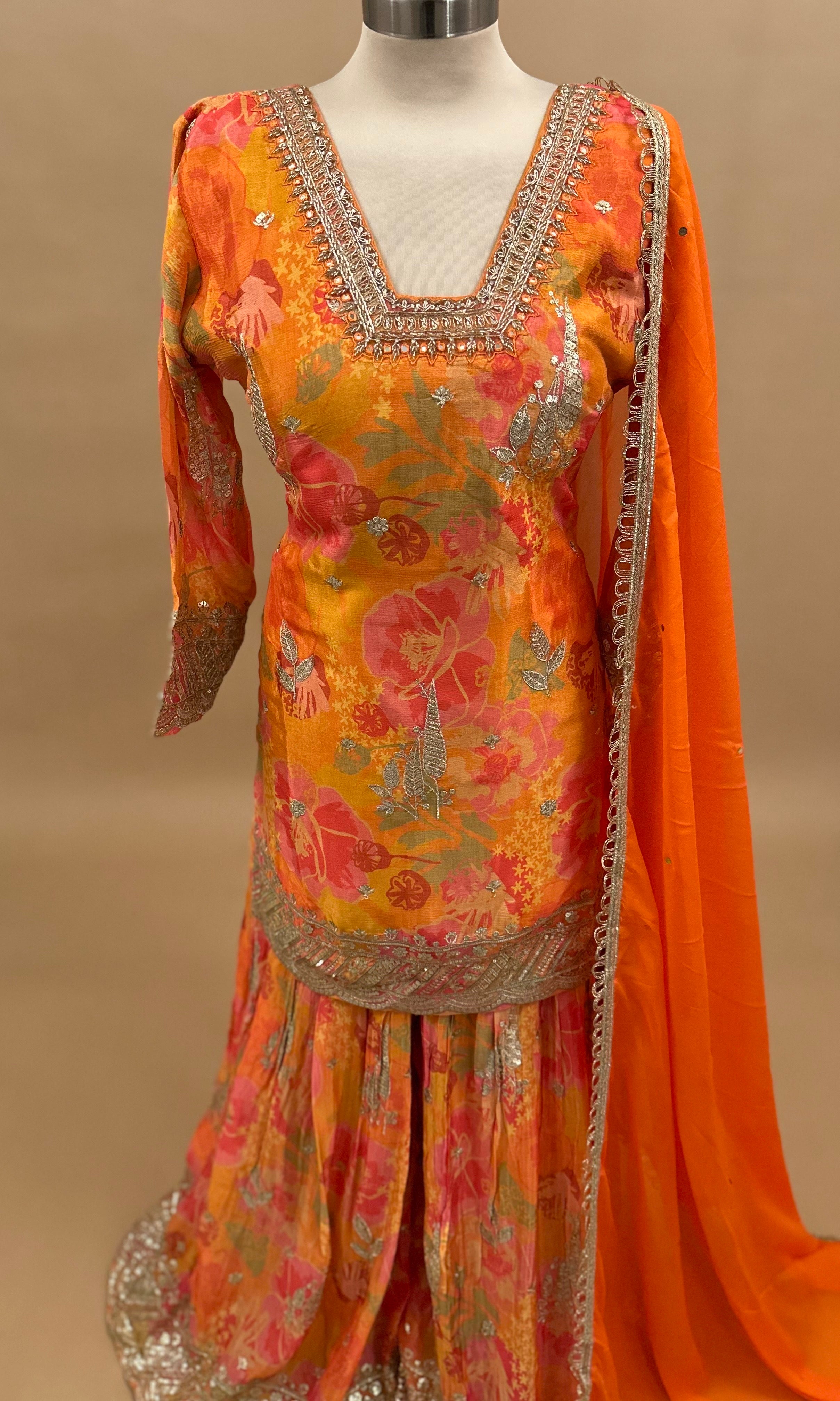 This elegant party wear palazzo suit features vibrant orange multicolor hues on soft Dasheen fabric, offering both comfort and style. Detailed with intricate sequin embroidery, it adds a subtle shimmer perfect for festive occasions. The matching dupatta completes the ensemble, making it an ideal choice for sophisticated celebrations.