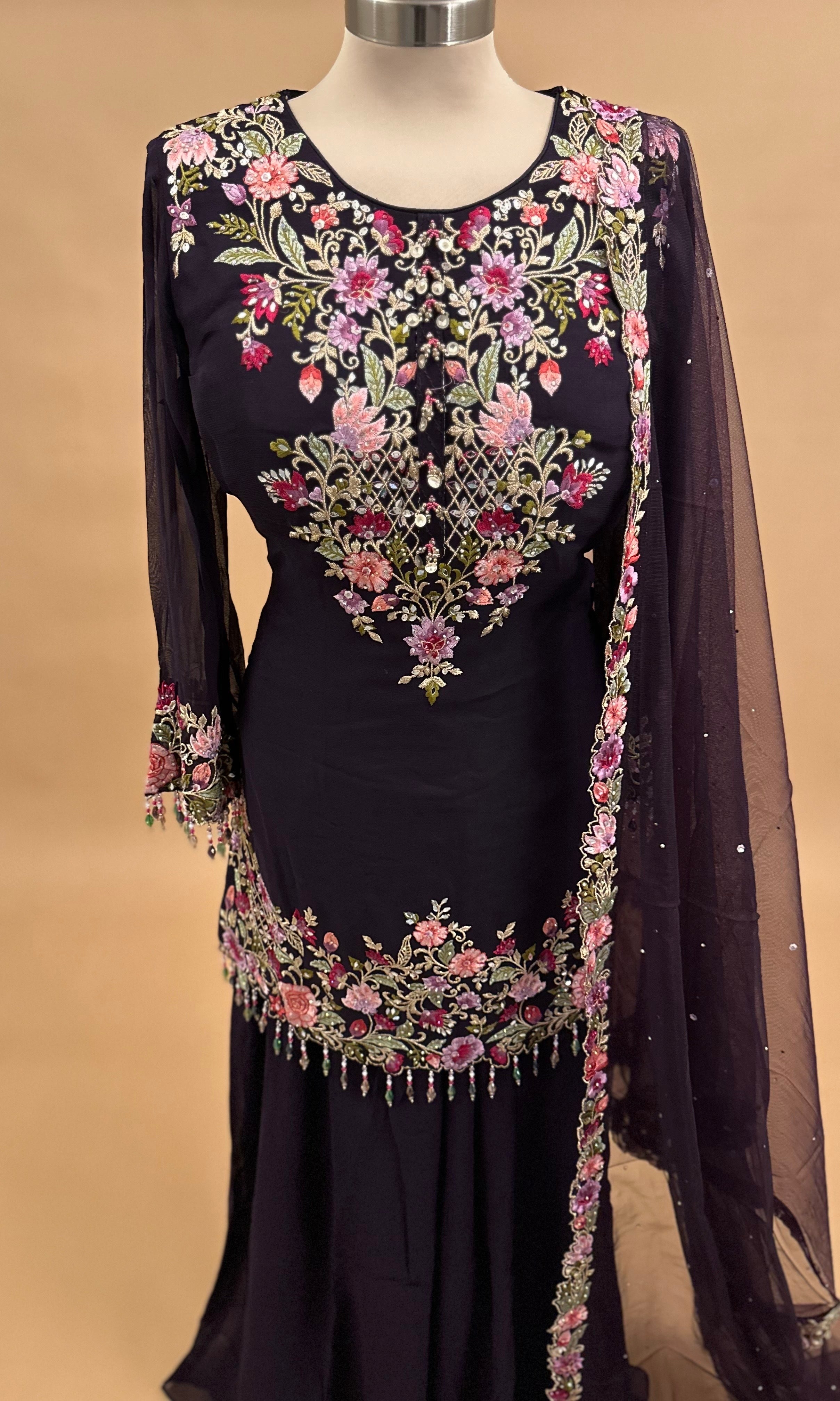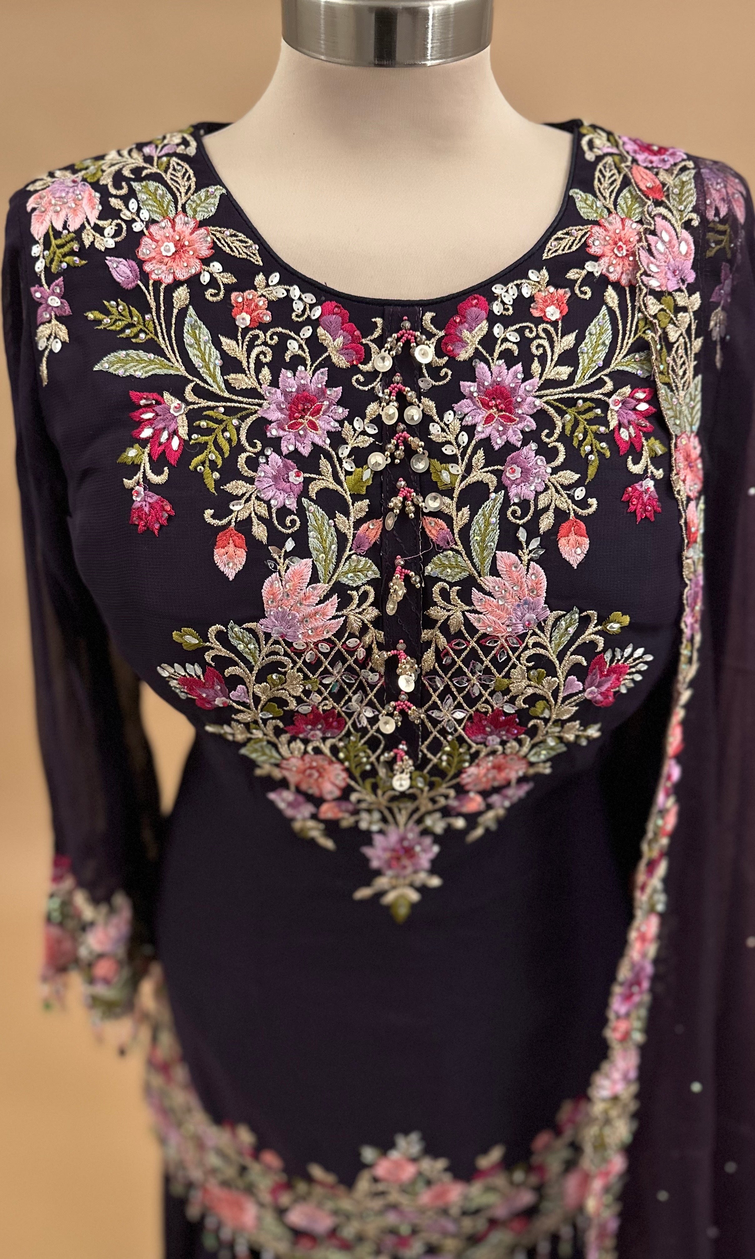 Elevate your party wardrobe with this exquisite Purple palazzo suit, meticulously crafted from premium dasheen fabric. The ensemble features intricate hand-embroidered stone work that adds sophisticated elegance to every occasion. The flowing palazzo silhouette offers comfort without compromising on style, while the coordinating dupatta completes the traditional look. Perfect for weddings, celebrations, and formal gatherings, this piece combines timeless craftsmanship with contemporary design. The rich Purple hue flatters all skin tones, making it a versatile addition to your ethnic collection.