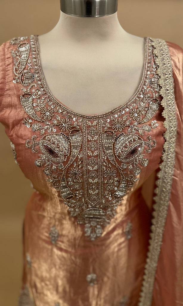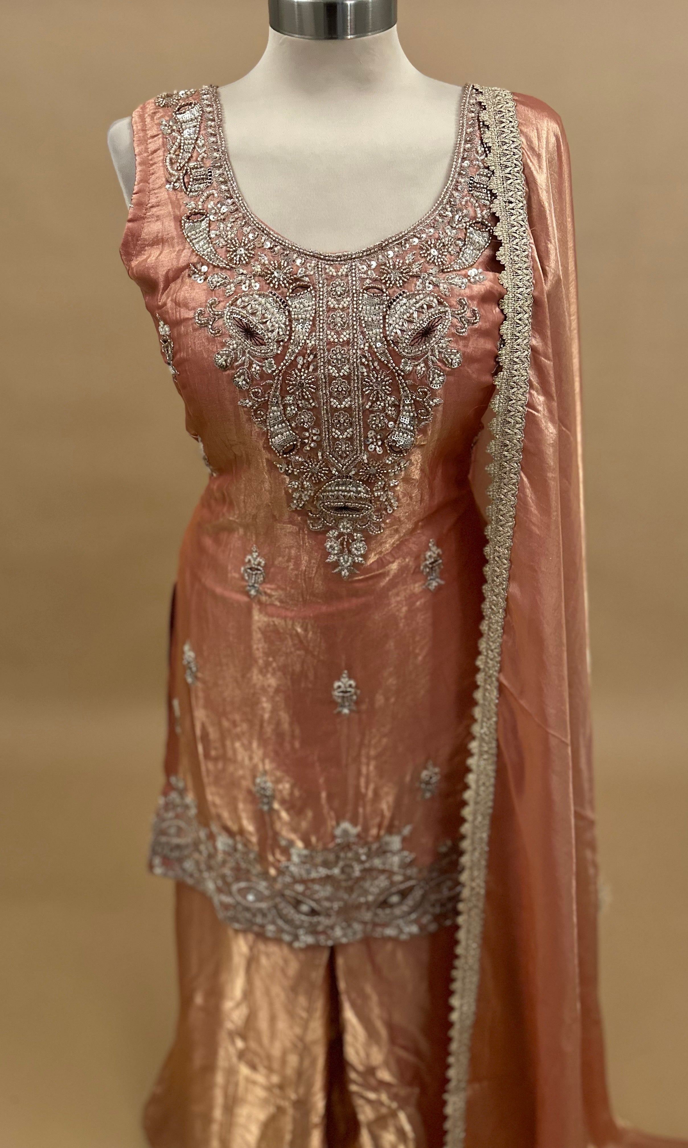This lightweight palazzo suit in dark peach features shimmering fabric that enhances its elegant appeal. The set includes a delicately embroidered dupatta adorned with intricate beadwork, adding a sophisticated touch to the ensemble. Perfect for festive occasions, this outfit combines comfort with refined craftsmanship for a graceful, contemporary look.