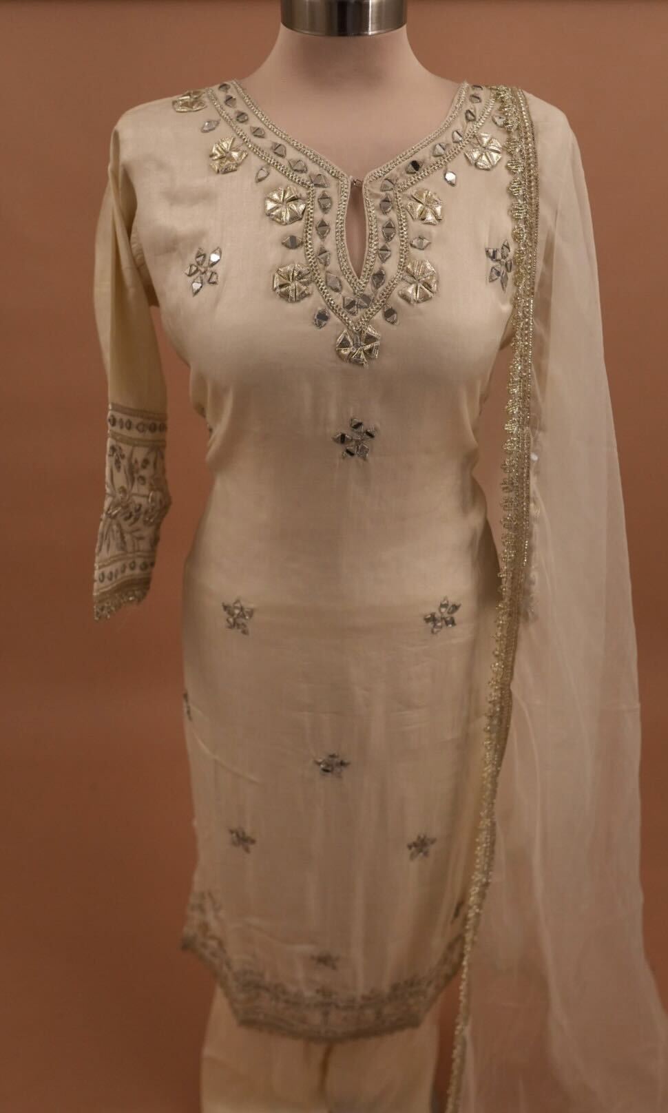 Elevate your ethnic wardrobe with this sophisticated long kameez suit crafted from premium crepe fabric in timeless ivory white. The ensemble features intricate mirror work embroidery that catches light beautifully, adding dimension and elegance to the silhouette. This three-piece set includes the flowing kameez, coordinating pants, and a graceful dupatta, offering a complete look for weddings, celebrations, or formal occasions. The crepe fabric drapes gracefully while maintaining its structure, ensuring comfort throughout wear. Perfect for those seeking refined traditional styling with contemporary appeal.