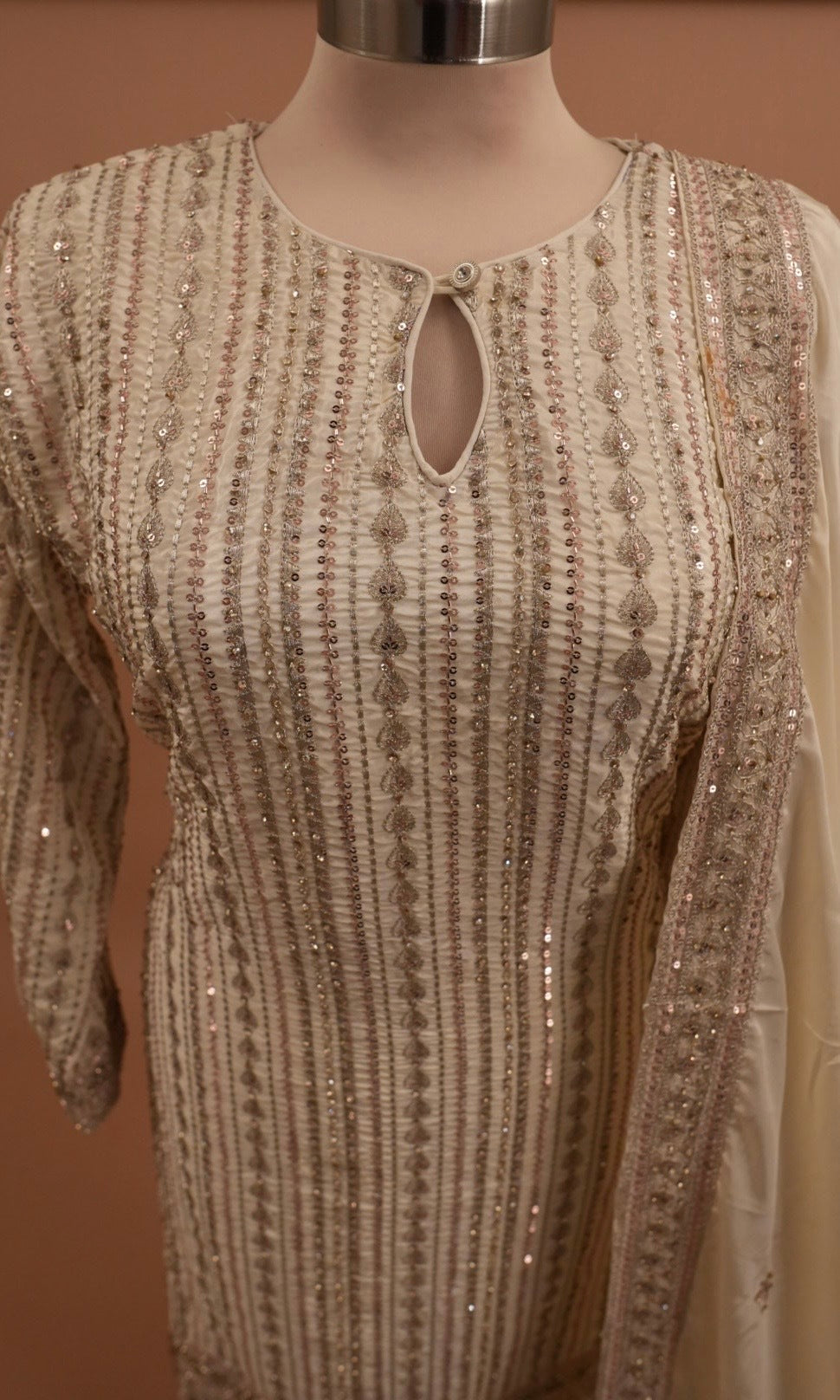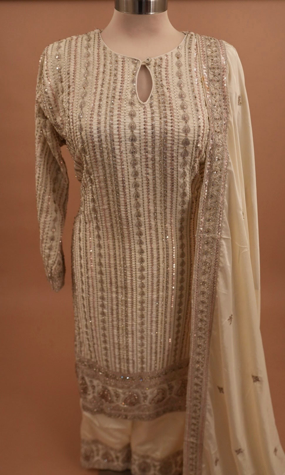 Elevate your party wardrobe with this stunning off-white Fendi silk kameez suit. Crafted from luxurious Fendi silk fabric, this long kameez features intricate stone work embroidery that adds sophisticated elegance to every occasion. The ensemble includes coordinating pants, creating a complete, polished look. Perfect for weddings, celebrations, and formal events, this piece combines traditional style with premium quality materials for timeless sophistication.