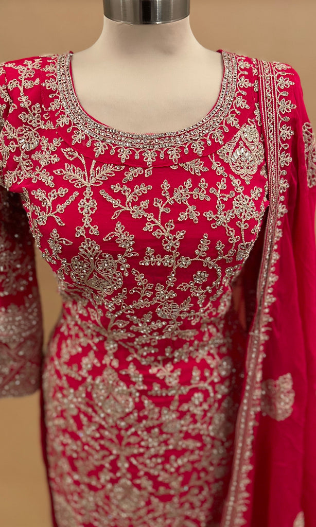 Elevate your party wardrobe with this stunning long kameez in pinkish red, crafted from luxurious georgette fabric. The intricate stone work embroidery adds sophisticated elegance and visual depth to the ensemble. This heavy suit features a flowing silhouette that drapes beautifully, paired with coordinating pants for a complete, polished look. Perfect for weddings, celebrations, and formal occasions, the rich red hue complements a variety of skin tones while the detailed embellishments showcase traditional craftsmanship. The georgette material ensures comfort throughout the day while maintaining its graceful structure and refined appearance.