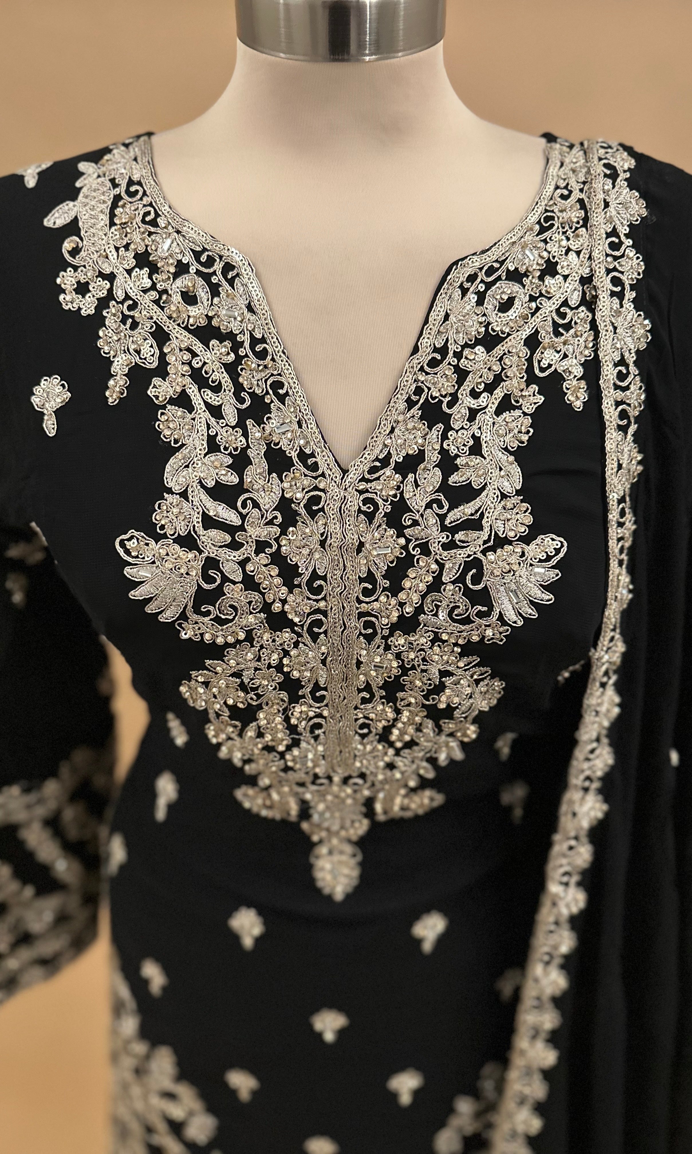Elevate your ethnic wardrobe with this sophisticated black kameez suit, crafted from luxurious georgette fabric. The ensemble features intricate stone work embroidery that adds refined elegance to the traditional silhouette. The long kameez is paired with coordinating pants, creating a complete, polished look perfect for celebrations, formal gatherings, or everyday wear. The lightweight georgette ensures comfort while maintaining the garment's graceful drape, making this piece both visually striking and wearable.