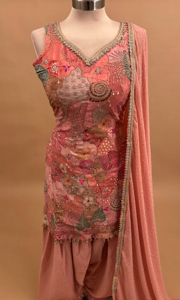 Stone Work Pinkish Red Color Embroiderey Party Wear Farshi Salwar Suit With Dupatta