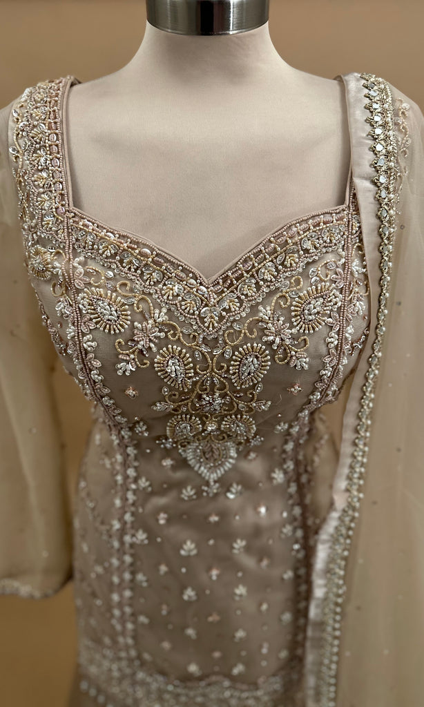 Elevate your evening ensemble with this sophisticated champagne-colored palazzo suit, crafted from luxurious organza fabric. The intricate beadwork embroidery adds refined elegance and dimension to the design, making it an ideal choice for upscale celebrations and formal gatherings. The flowing palazzo silhouette offers graceful movement and comfort, while the included dupatta completes the traditional aesthetic. Perfect for weddings, receptions, and special occasions where timeless style meets contemporary flair.