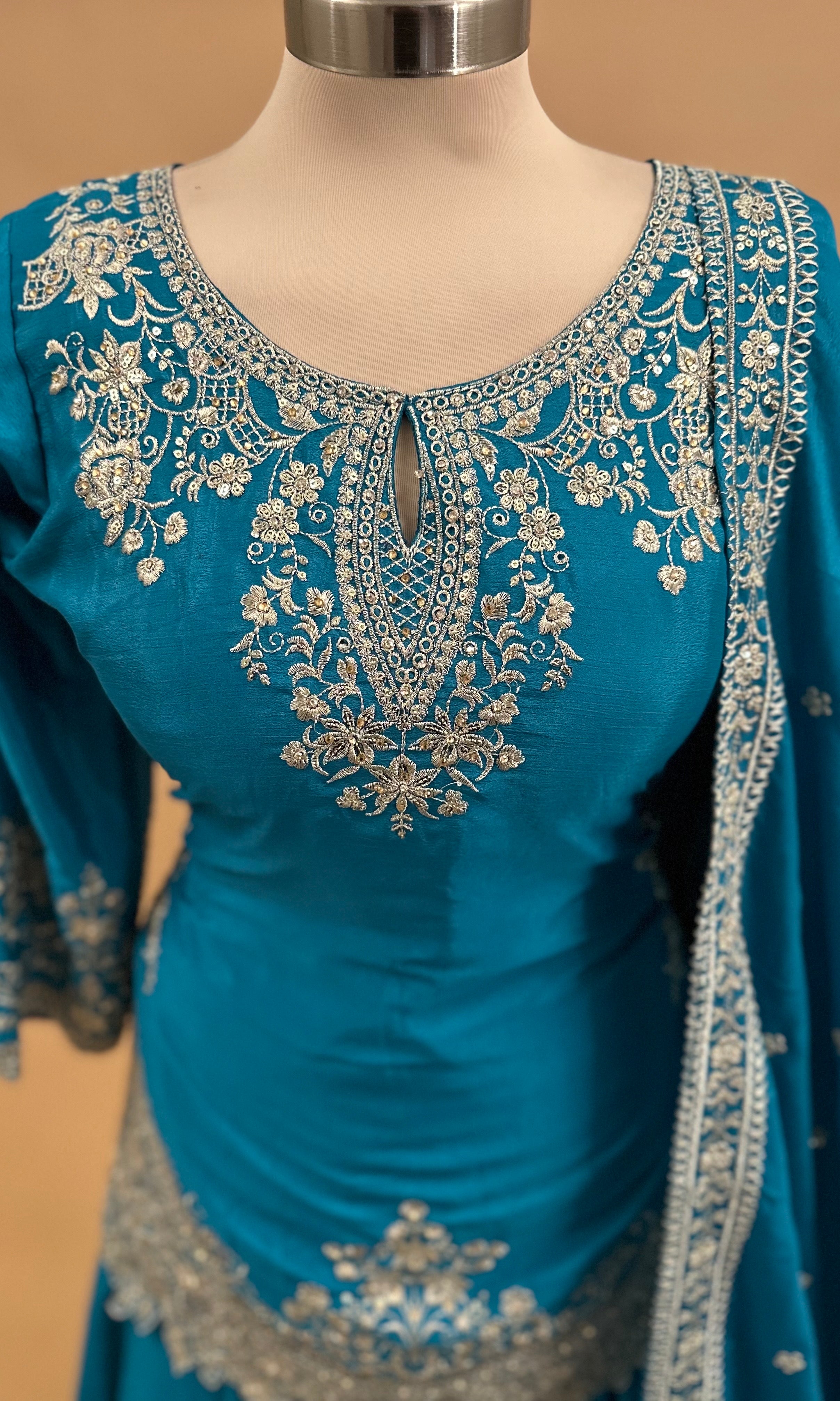 Elevate your festive wardrobe with this stunning Blue Chinon fabric palazzo suit, expertly crafted for sophisticated celebrations. The ensemble features intricate sequin embroidery that catches light beautifully, adding glamorous dimension to the design. Chinon's lightweight, breathable weave ensures comfort throughout extended wear, while the flowing palazzo silhouette offers graceful movement and contemporary elegance. The coordinating dupatta completes the look with traditional refinement. Perfect for weddings, parties, and special occasions where refined style meets festive flair.