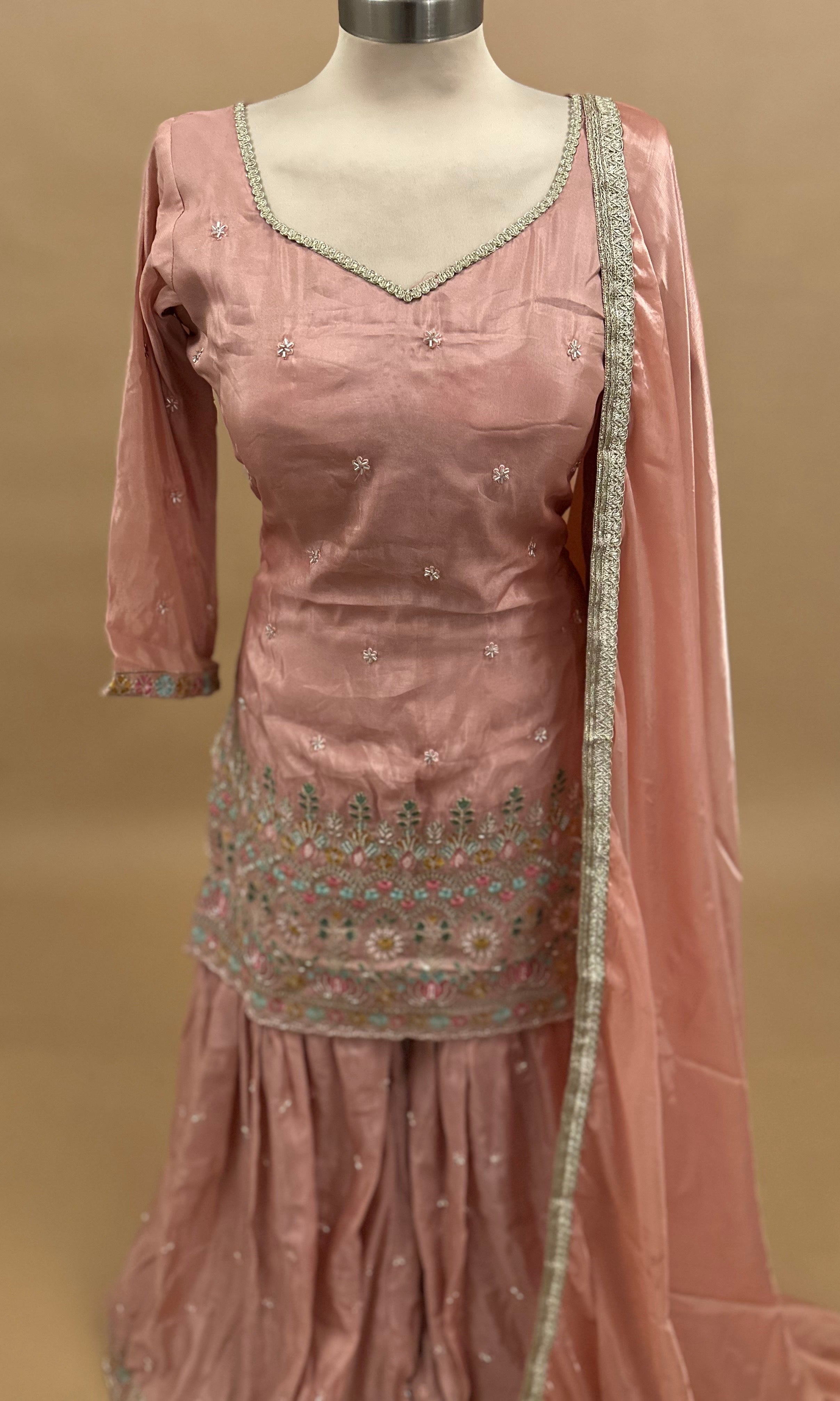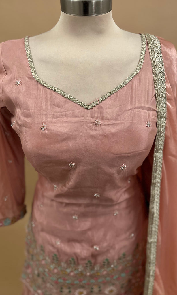 This elegant light weight party wear palazzo suit features a Peach unknown fabric that offers a graceful drape and comfortable fit. Adorned with delicate stone embroidery, it adds a subtle shimmer perfect for festive occasions. The matching dupatta complements the ensemble, creating a sophisticated look for your special events. Crafted to combine style and comfort, this suit is ideal for those seeking refined elegance with contemporary charm.