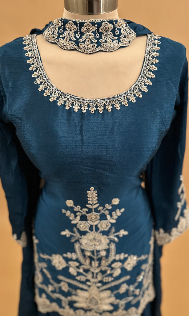 Elevate your party wardrobe with this stunning Teal Blue Chinon fabric palazzo suit, expertly crafted for sophisticated occasions. The ensemble features an elegant choker-style dupatta that frames the neckline beautifully, while intricate sequin embroidery adds glamorous dimension throughout. The lightweight Chinon fabric drapes gracefully, ensuring comfort without compromising on style. This coordinated set combines traditional elegance with contemporary design, making it an ideal choice for weddings, celebrations, and formal gatherings. The included dupatta completes the look with versatile styling options.