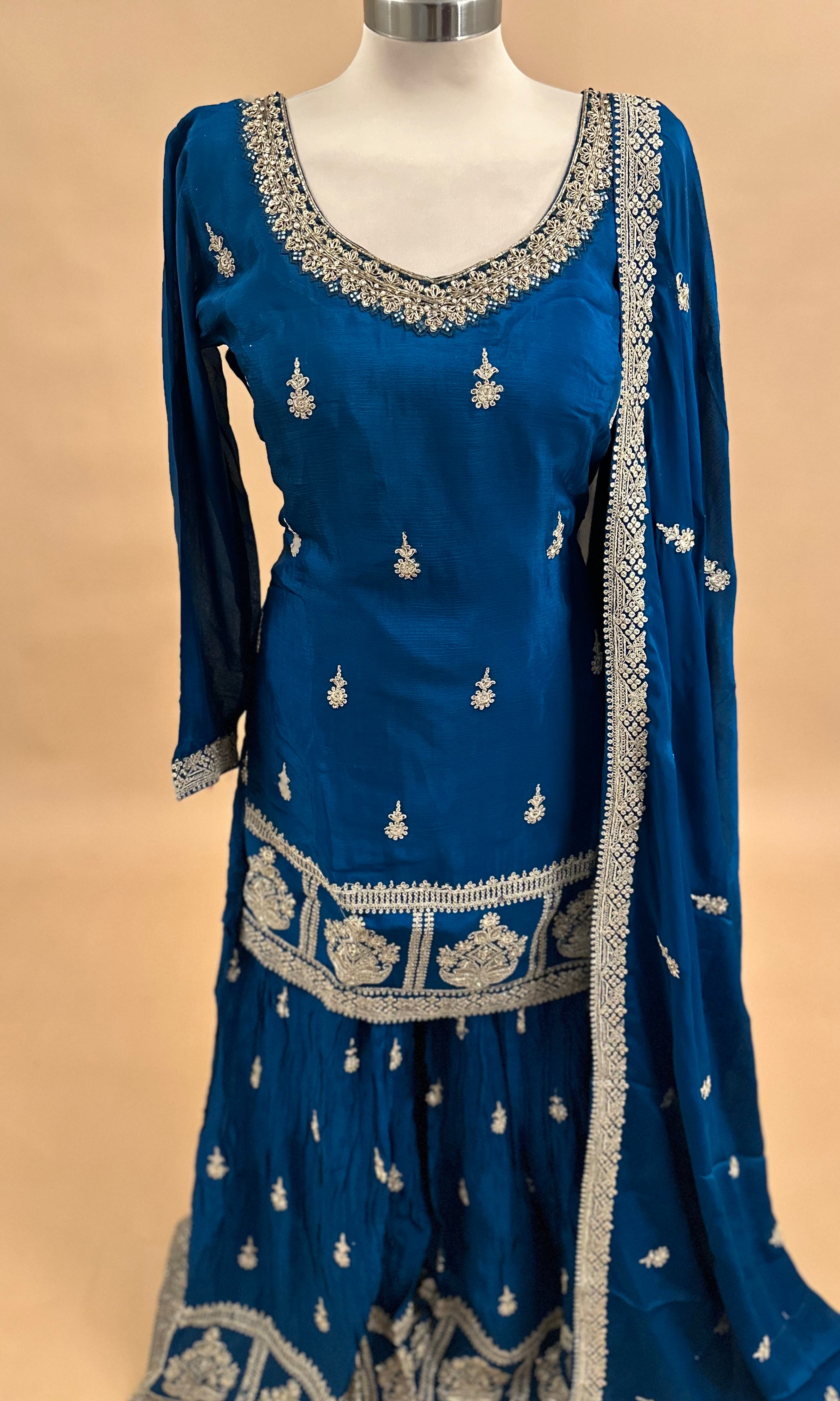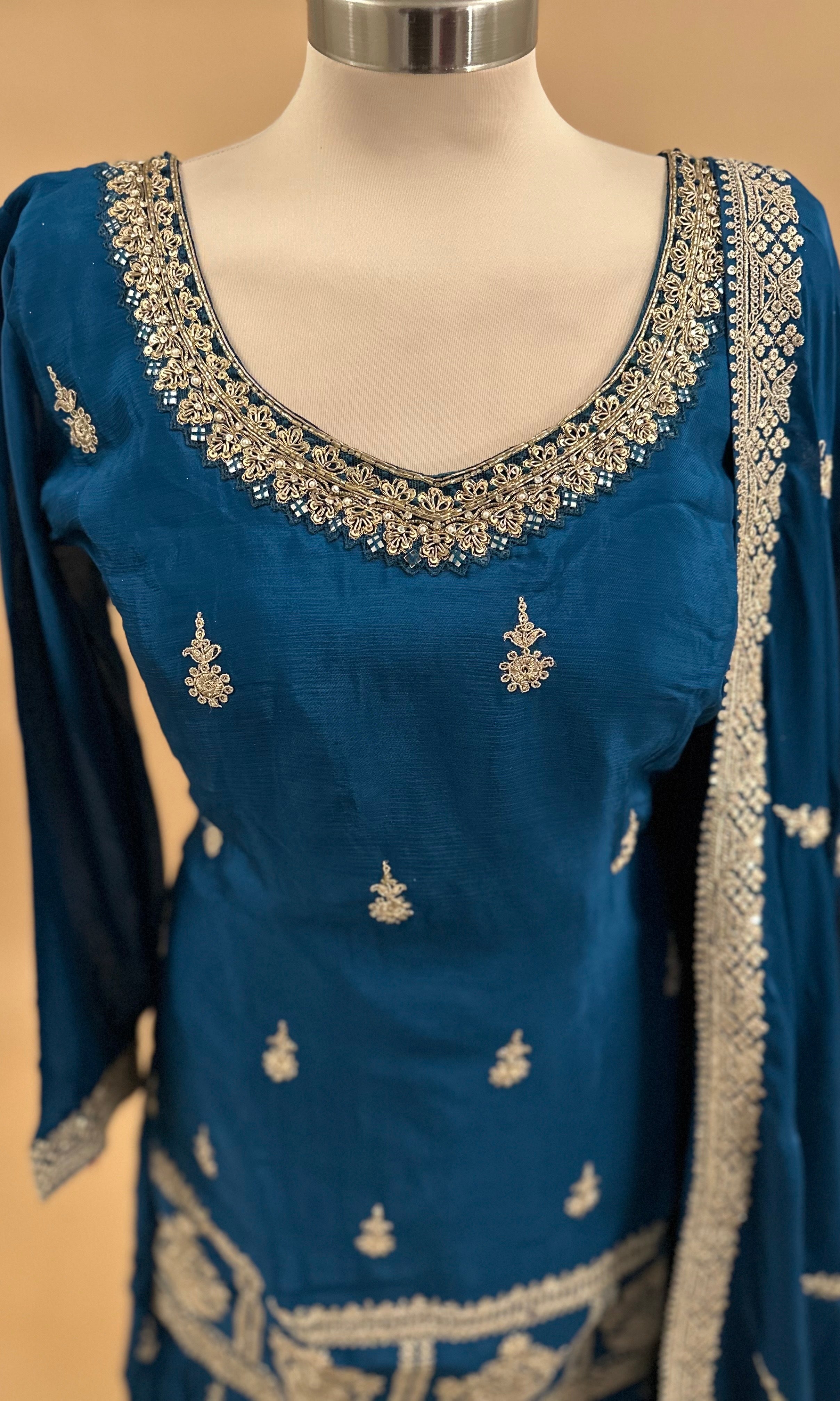 Elevate your party wardrobe with this sophisticated palazzo suit crafted from premium dasheen fabric in a rich dark navy blue. The ensemble features intricate sequin embroidery that catches light beautifully, adding glamour and dimension to your look. The flowing palazzo silhouette offers comfort without compromising elegance, while the included dupatta completes the traditional aesthetic. Perfect for weddings, celebrations, and formal gatherings, this piece combines timeless style with contemporary flair. The dasheen fabric drapes gracefully, ensuring you look polished and refined throughout the evening.