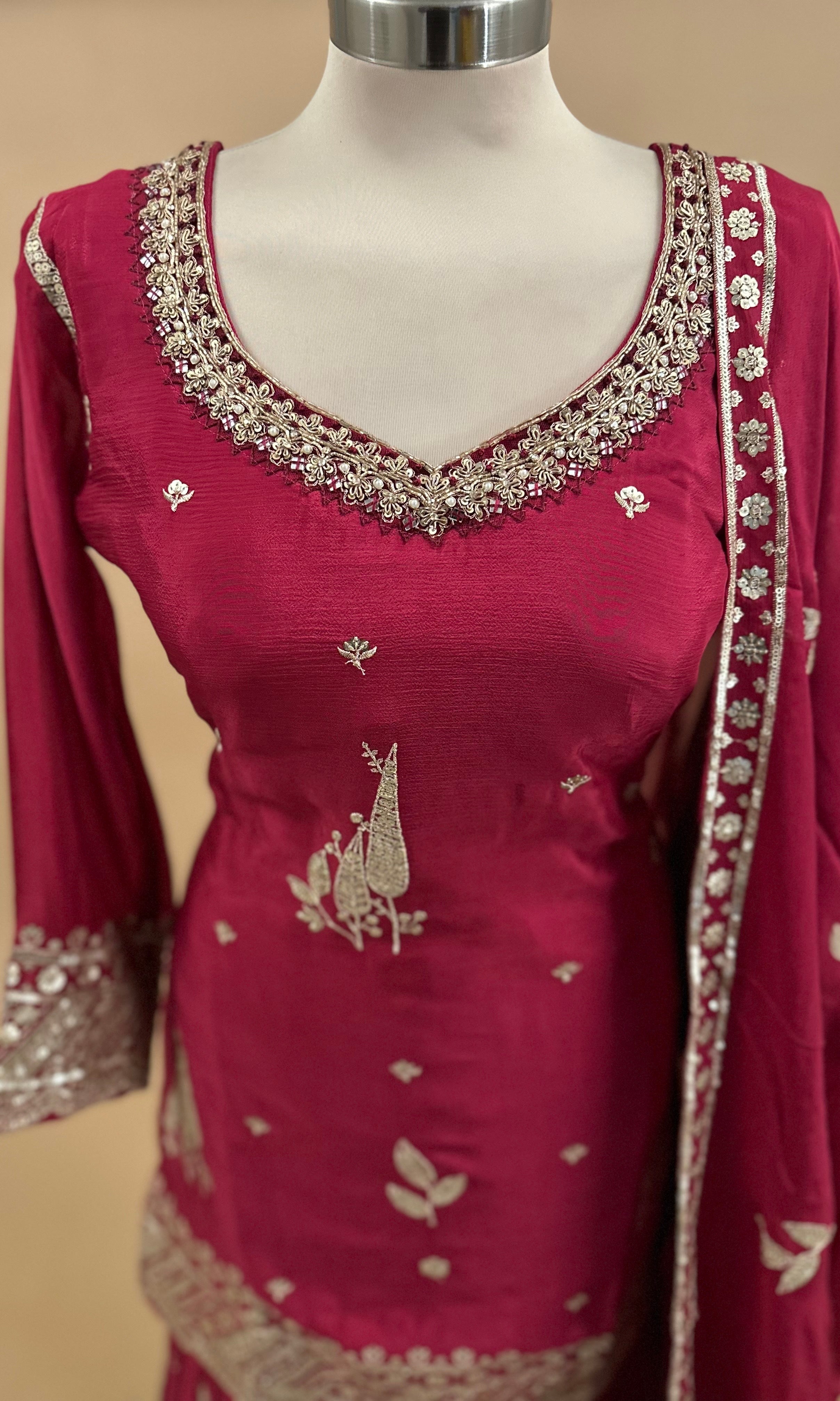 Elevate your party wardrobe with this stunning Bright Maroon palazzo suit crafted from luxurious dasheen fabric. The ensemble features intricate sequin embroidery that catches light beautifully, creating an eye-catching shimmer perfect for celebrations and special occasions. The flowing palazzo silhouette offers comfort without compromising on elegance, while the coordinating dupatta adds versatility to your styling options. Dasheen's natural drape ensures a graceful, sophisticated look that flatters various body types. Ideal for weddings, festivals, and formal gatherings where you want to make a memorable impression.