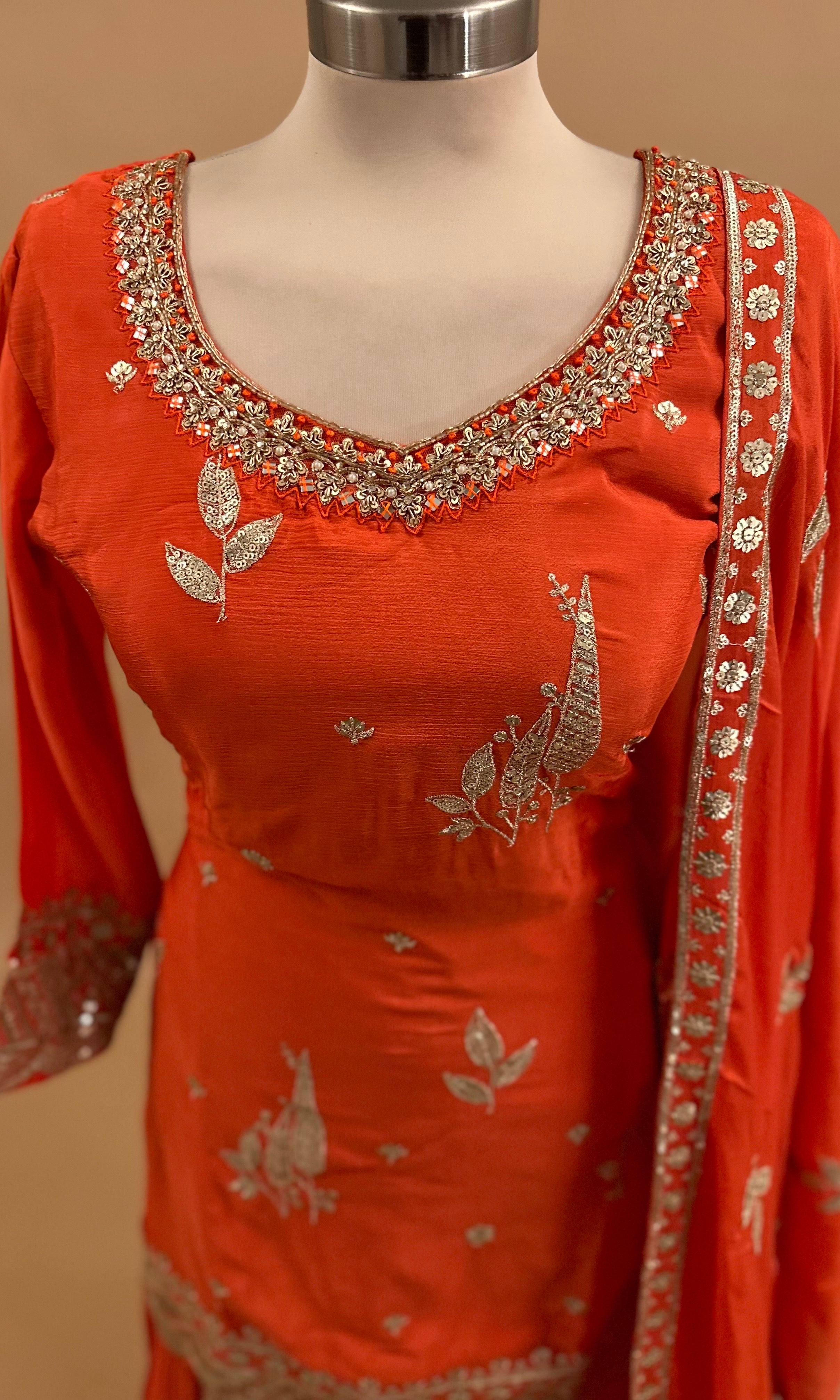 Elevate your party wardrobe with this stunning Orange palazzo suit crafted from luxurious dasheen fabric. The ensemble features intricate sequin embroidery that catches light beautifully, creating an eye-catching shimmer perfect for celebrations and special occasions. The flowing palazzo silhouette offers comfort without compromising on elegance, while the coordinating dupatta adds versatility to your styling options. Dasheen's natural drape ensures a graceful, sophisticated look that flatters various body types. Ideal for weddings, festivals, and formal gatherings where you want to make a memorable impression.
