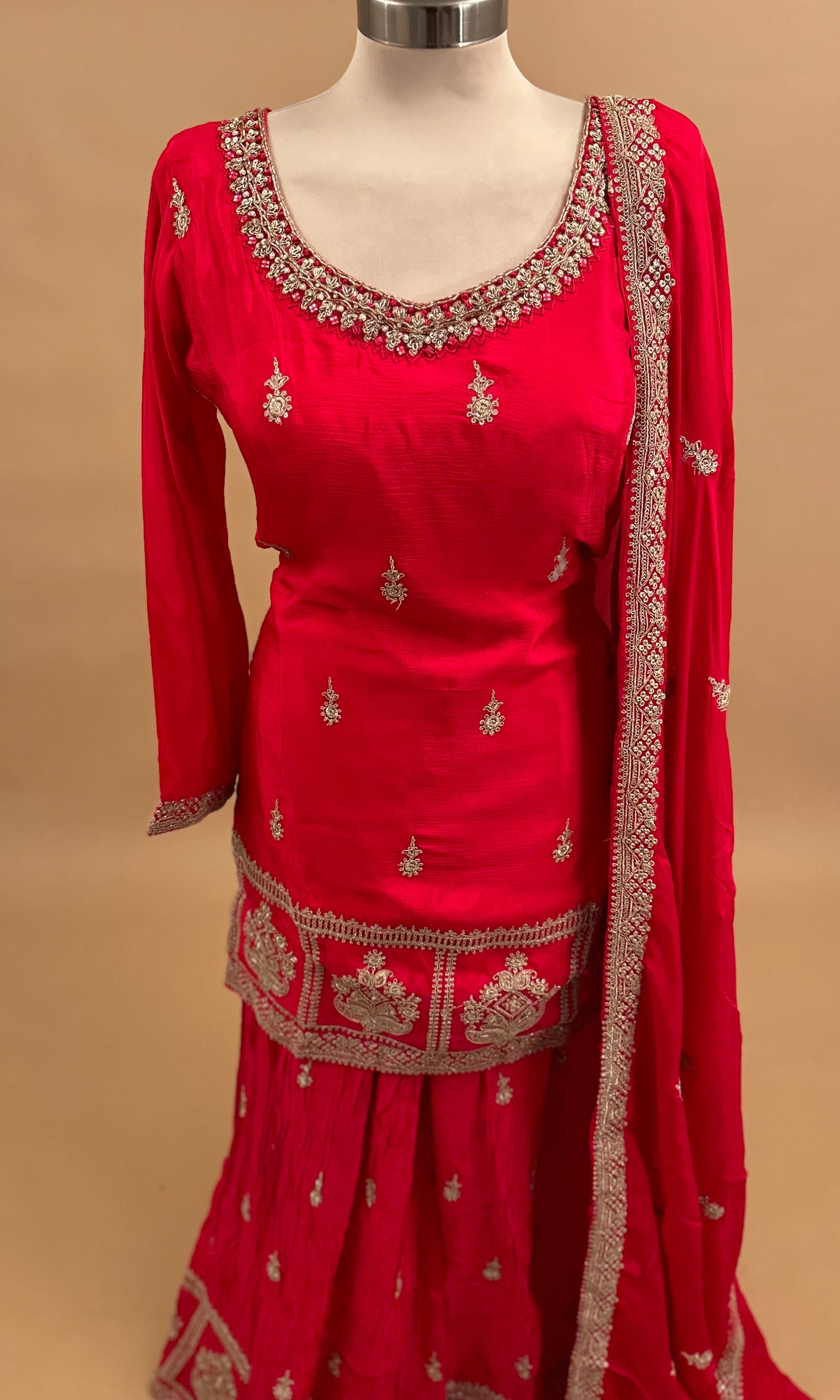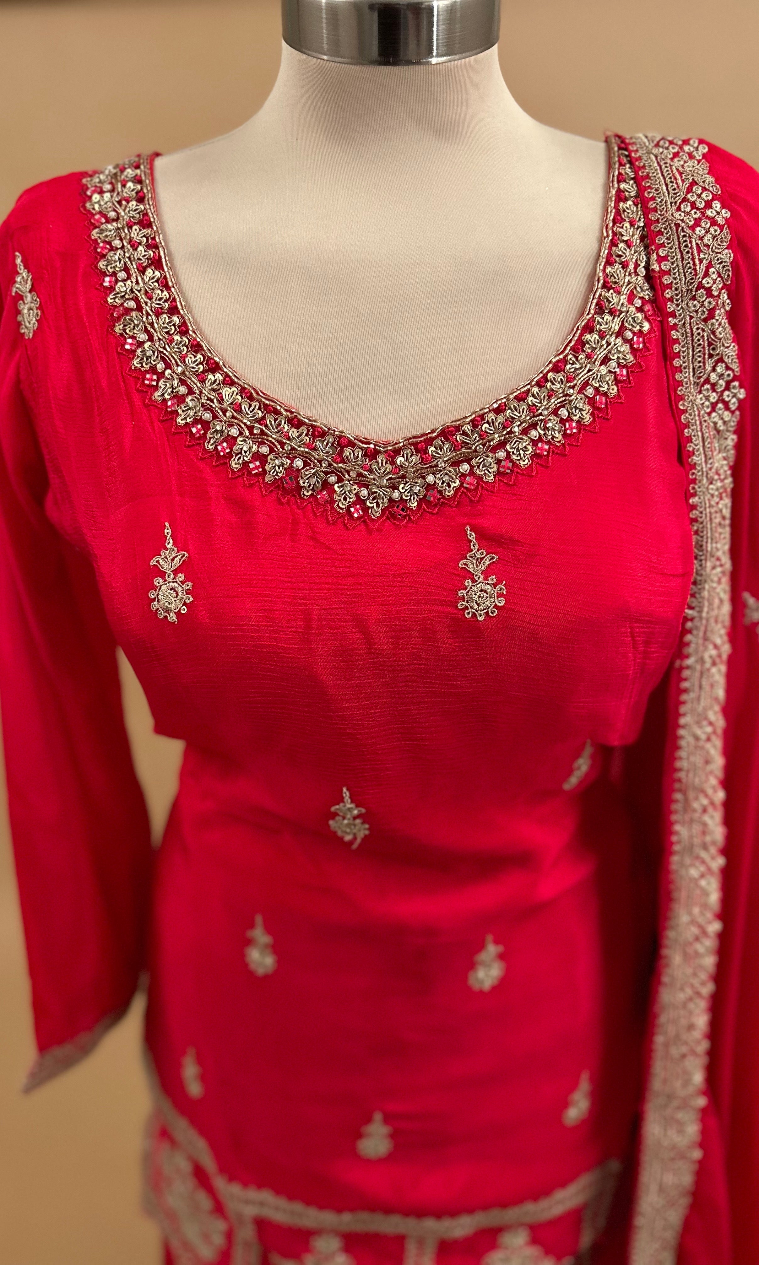 Elevate your party wardrobe with this sophisticated palazzo suit crafted from premium dasheen fabric in a rich Pinkish Red. The ensemble features intricate sequin embroidery that catches light beautifully, adding glamour and dimension to your look. The flowing palazzo silhouette offers comfort without compromising elegance, while the included dupatta completes the traditional aesthetic. Perfect for weddings, celebrations, and formal gatherings, this piece combines timeless style with contemporary flair. The dasheen fabric drapes gracefully, ensuring you look polished and refined throughout the evening.
