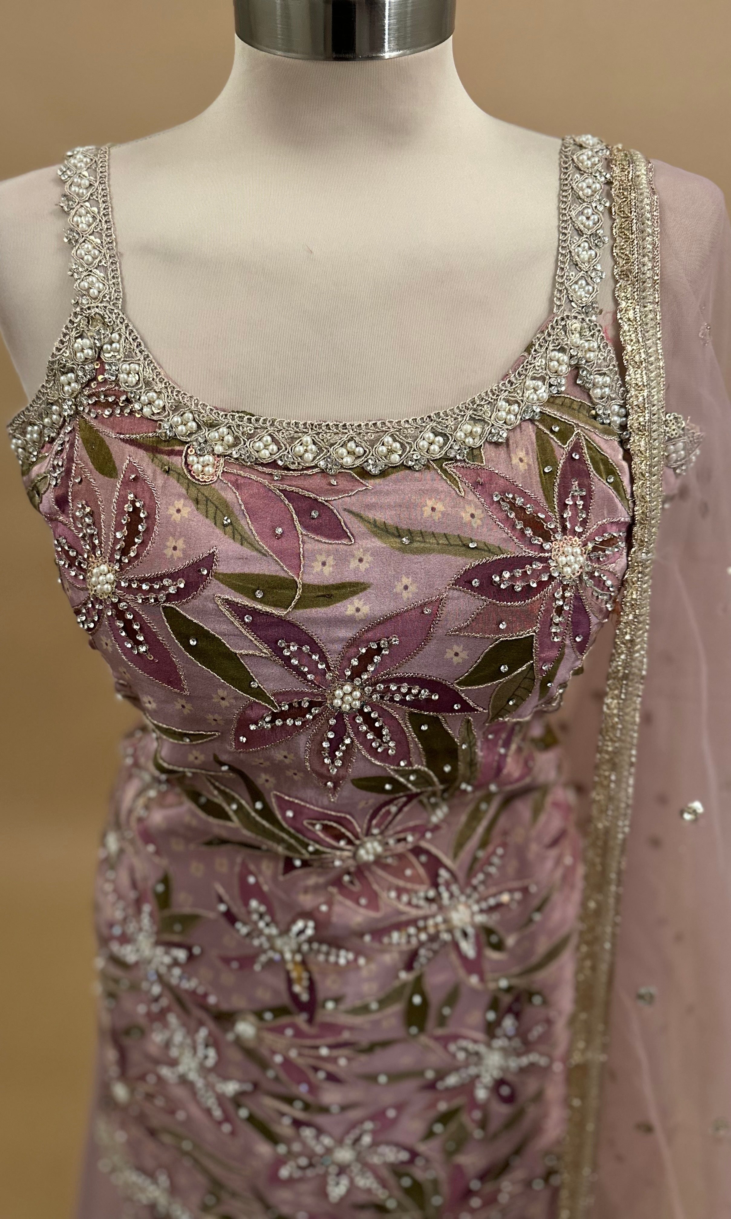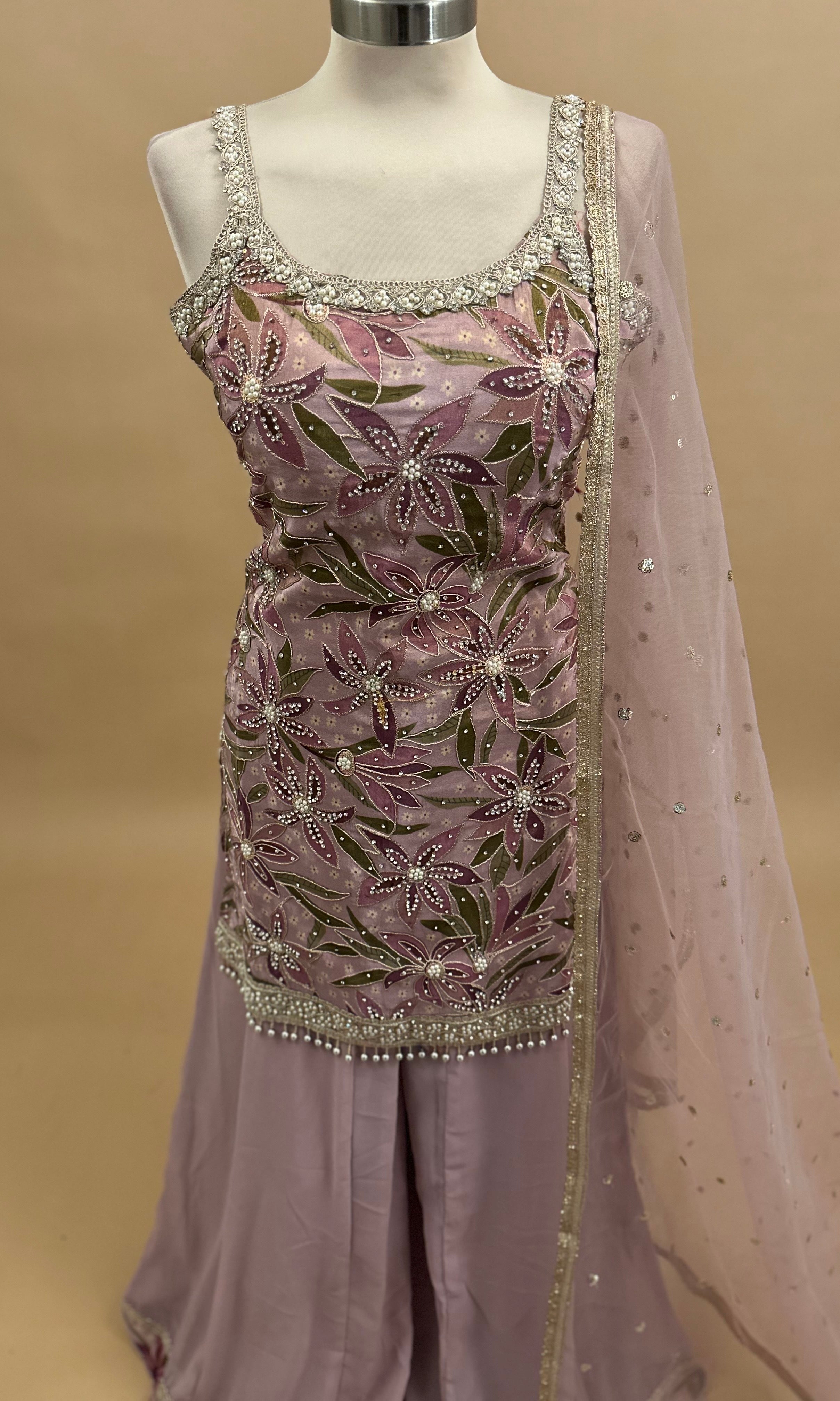 Elevate your ethnic wardrobe with this exquisite dusty purple palazzo suit, crafted from luxurious georgette fabric. Adorned with intricate pearl and stone embroidery work, this ensemble features a sophisticated color palette that complements all skin tones. The flowing palazzo silhouette offers comfort without compromising on elegance, while the included dupatta adds versatility for layering and styling. Perfect for weddings, festive occasions, or upscale gatherings, this piece combines traditional craftsmanship with contemporary design sensibilities.