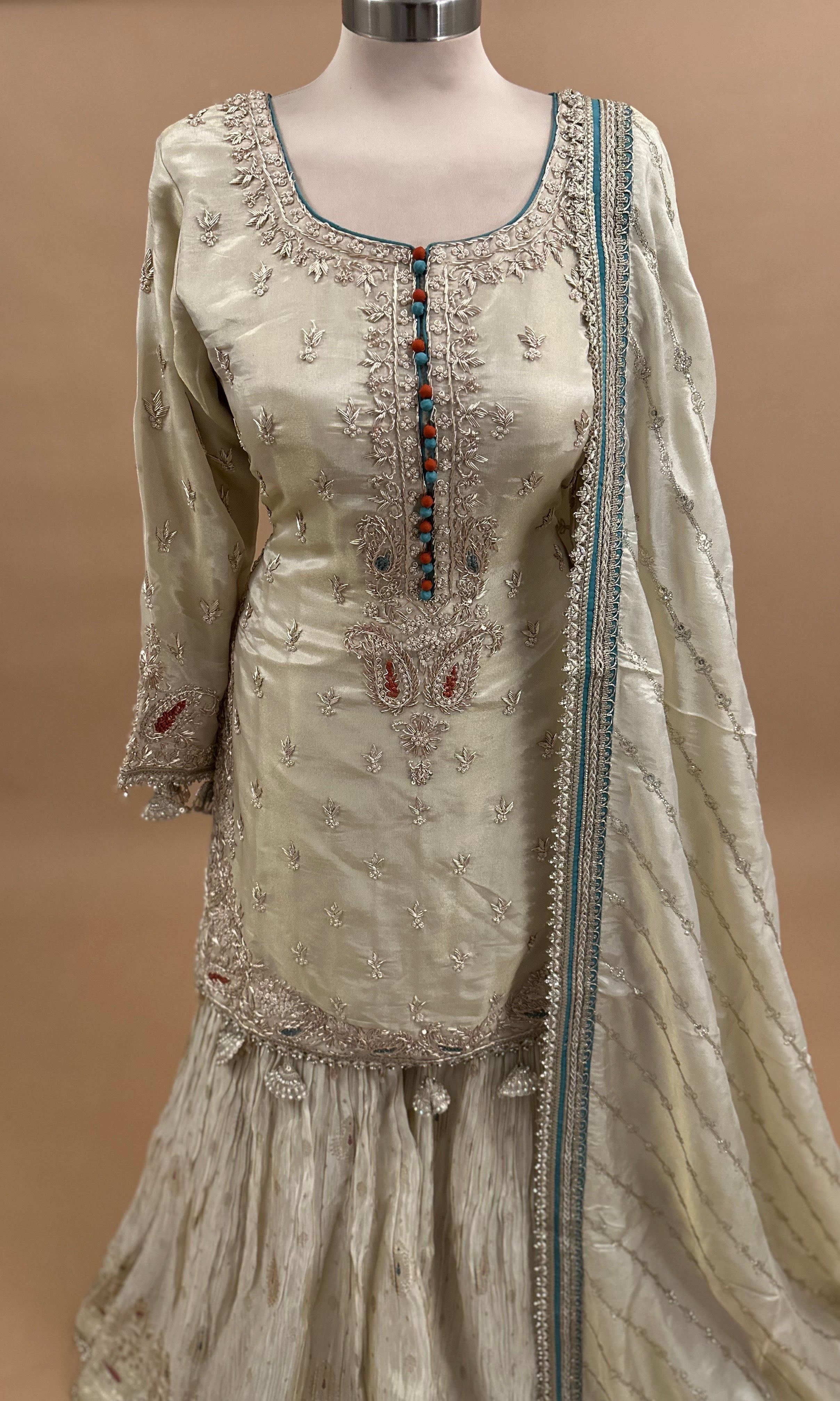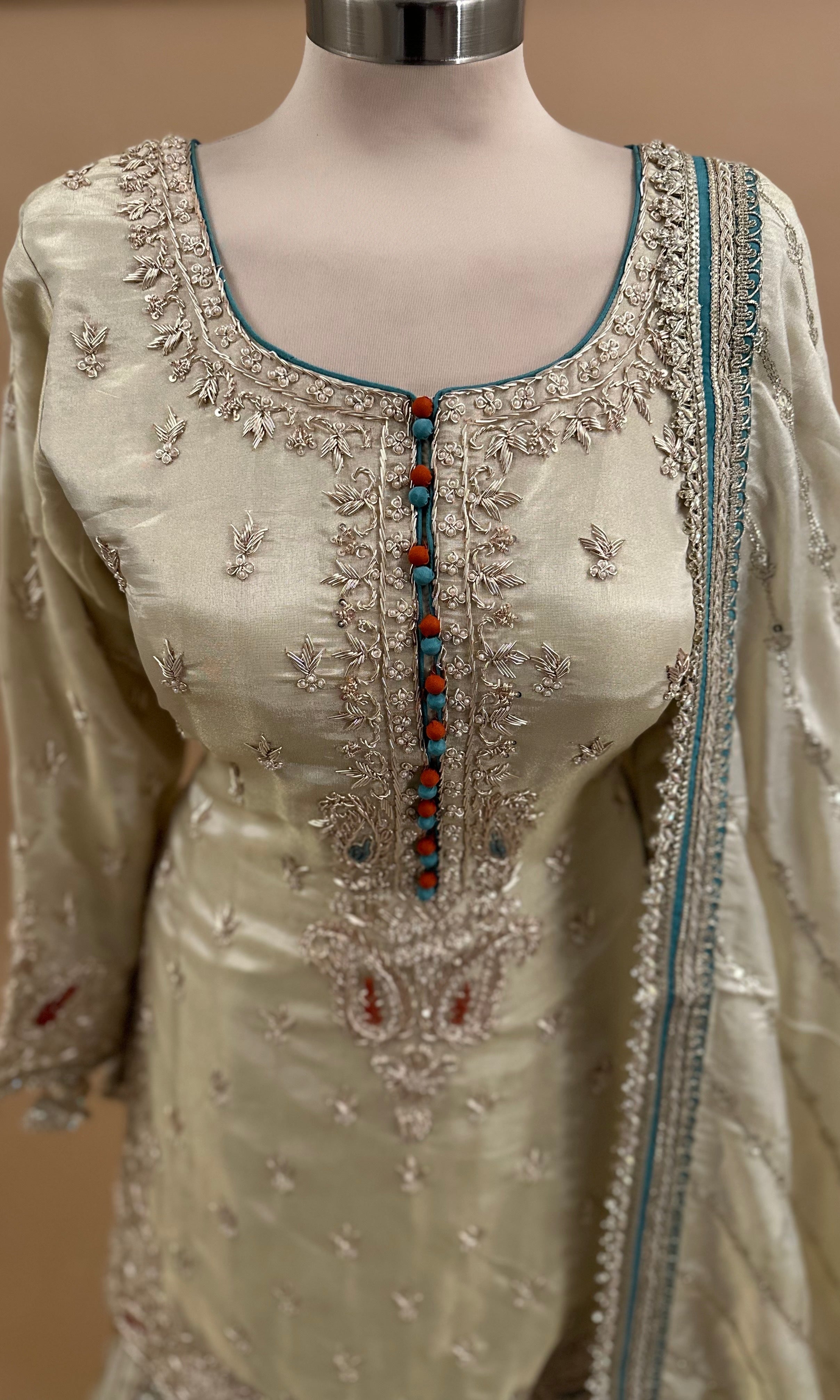 Elevate your festive wardrobe with this exquisite hand-embroidered sharara suit, meticulously crafted for sophisticated celebrations. The ivory shimmer fabric creates an ethereal luminescence, while intricate beadwork adorns the ensemble with timeless elegance. The coordinating heavy dupatta drapes gracefully, adding dimension and traditional charm. Perfect for weddings, engagements, and special occasions, this piece combines artisanal craftsmanship with contemporary styling. The luxurious shimmer finish catches light beautifully, ensuring you stand out with understated glamour and refined grace.